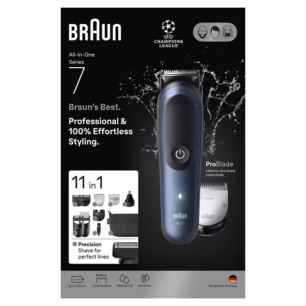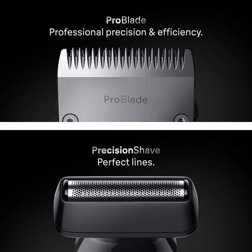 Unlock effortless grooming from head to toe with the Braun 11-in-1 Trimmer. This versatile kit provides professional styling capabilities for your beard, hair, and body. The curated tools allow for precise beard trimming, ear and nose hair removal, meticulous hair clipping, and comprehensive manscaping. Achieve ultimate precision with the Ultra Sharp ProBlade, ensuring clean and defined lines every time. Autosense Technology provides maximum efficiency, adapting to your beard’s density for a consistent trim. Enjoy unlimited versatility with the Precision Shave head, designed for perfect lines and clean shaves. The beard trimmer offers 14 length settings (0.5–21 mm) for customized styling. Groom with confidence, even on sensitive skin, thanks to SkinGuard technology, which prioritizes safety and comfort on delicate body areas. The trimmer is built to last, featuring 100% waterproof construction with AquaGrip for secure control, even in the shower. A long-lasting Li-Ion battery delivers up to 120 minutes of cordless runtime for uninterrupted grooming sessions. Experience the convenience and performance of a complete grooming solution in one device.