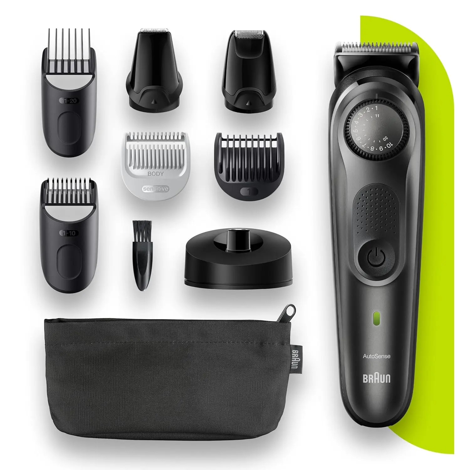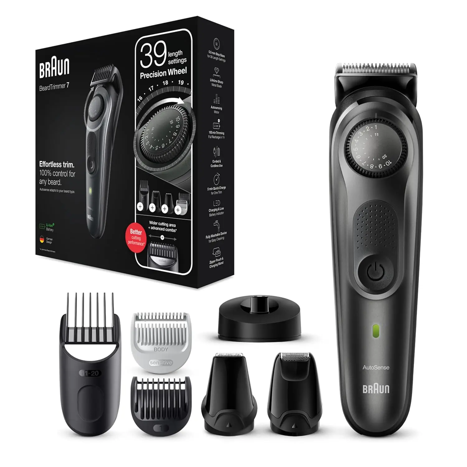 Experience the ultimate in beard grooming with the Braun Beard Trimmer 7. This trimmer is engineered for sharpness, speed, and efficiency, featuring a wider cutting area that captures and cuts more hair with every stroke compared to previous Braun models. Achieve 100% precision and control with the innovative precision comb, designed with 20% less plastic for effortless trimming. The precision wheel offers an impressive 39 length settings in precise 0.5 mm increments, ranging from 0.5 to 20 mm, allowing you to shape, style, and detail your beard, mustache, goatee, or stubble with unparalleled accuracy. Built to last, the Braun Beard Trimmer 7 boasts lifetime sharp blades, ensuring easy, even, and consistent trimming at any length. Benefit from advanced German engineering with a powerful Li-Ion battery that provides a long-lasting 100-minute runtime. For added safety and gentleness, the trimmer comes with an additional safety comb. This trimmer redefines beard grooming with its innovative design and long lasting use. Trim your beard and mustache with great accuracy and control with multiple settings and long lasting battery use. It is important to have a good tool that is precise and provides the desired results, the Braun Beard Trimmer is your ultimate grooming tool.