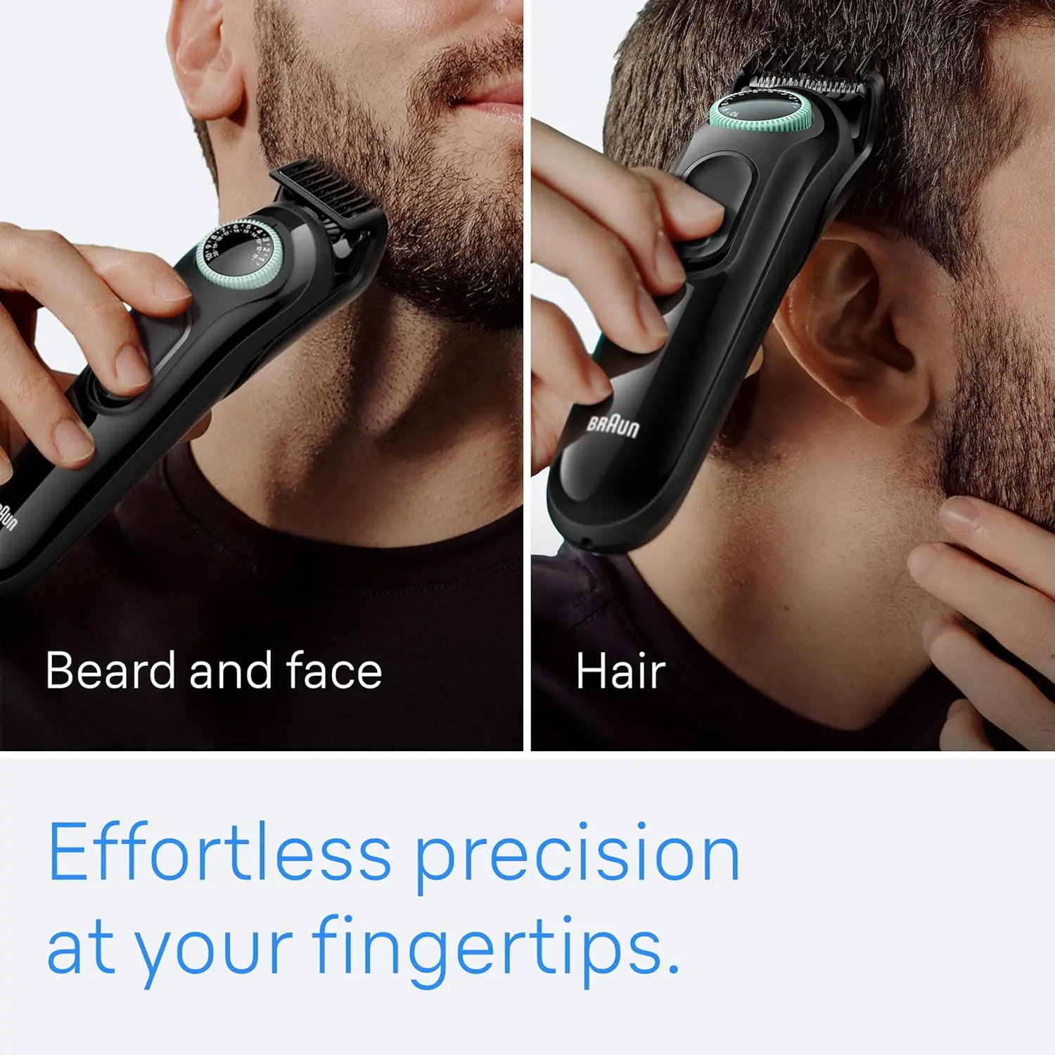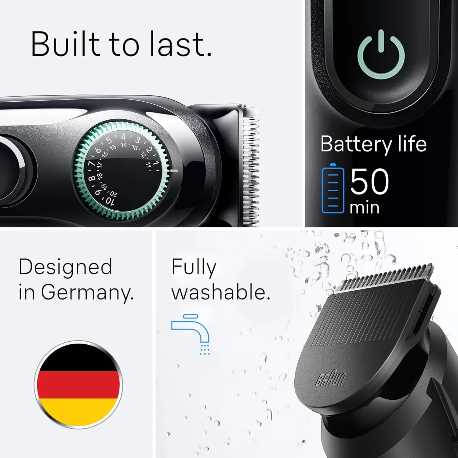 Achieve the perfect look with the Braun Series 3 7-in-1 Trimmer, your all-in-one solution for precise beard and hair grooming. This versatile trimmer offers unlimited versatility and ultimate precision, featuring 40 length settings adjustable in incredibly fine 0.02” steps. Whether you’re maintaining a meticulously sculpted beard, trimming your hair, or grooming other areas, this trimmer delivers consistent and accurate results every time. The included adjustable beard and hair combs provide even greater control and customization, allowing you to achieve your desired style with ease. Experience easy grooming with the ultra-sharp blade, designed for efficient and fast trimming all over. This powerful blade effortlessly cuts through hair without pulling or tugging, making your grooming routine quick and comfortable. Built to last, this trimmer for men is equipped with a powerful battery that provides a generous 50-minute cordless runtime, giving you ample time to complete your grooming session. The long-lasting blades ensure consistent performance over time, while the washable head and combs make cleaning and maintenance a breeze. The Braun Series 3 7-in-1 Trimmer is always ready to use, and comes complete with a soft pouch to keep all of the accessories organized and easily accessible. This trimmer is not only a grooming essential, but also a proud Movember 2025 participant, supporting men’s health initiatives. Invest in a grooming tool that offers precision, power, and longevity – the Braun Series 3 7-in-1 Trimmer is the perfect addition to any man’s grooming arsenal.