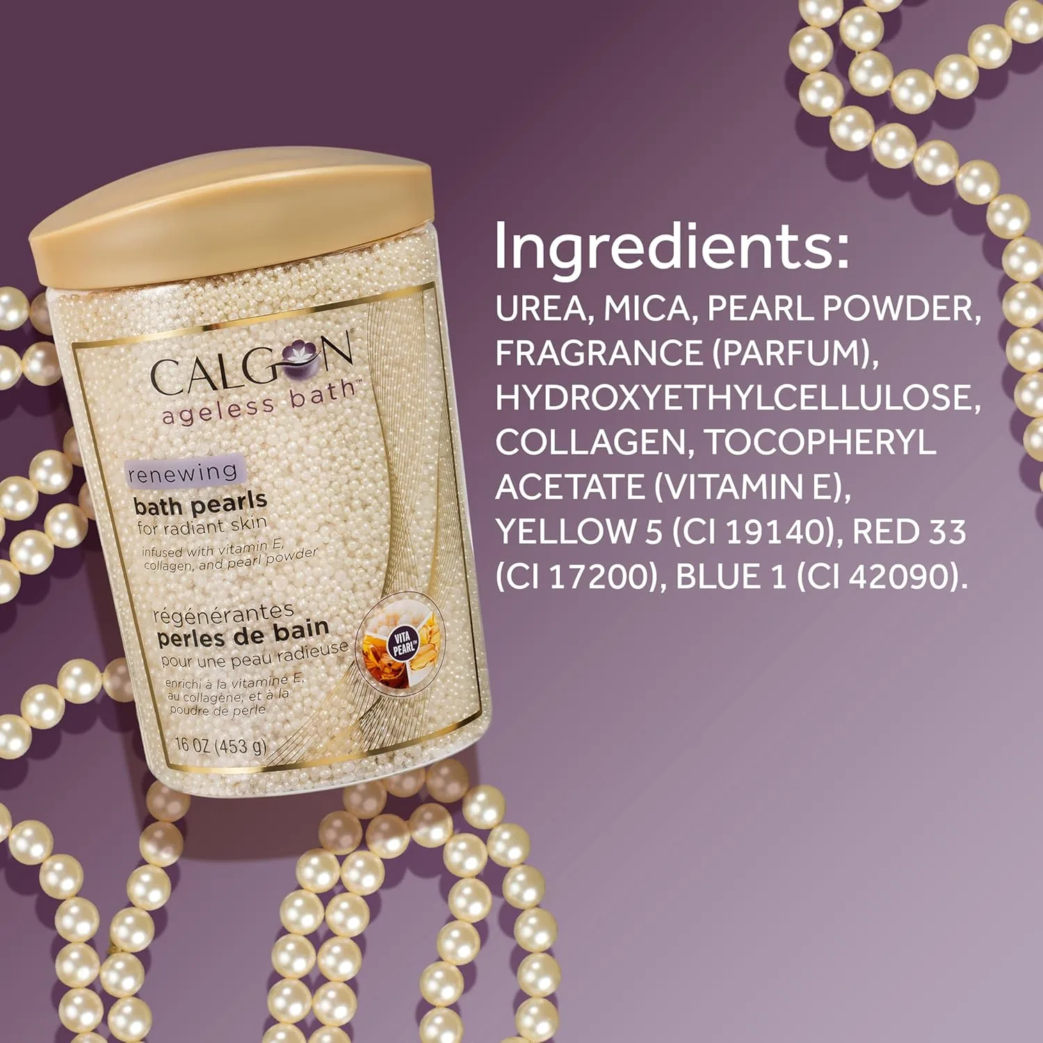 Indulge in a luxurious bath with Calgon Ageless Renewing Bath Pearls. Vita-Pearl Technology hydrates, restores radiance, & leaves skin soft & smooth. No harsh ingredients.