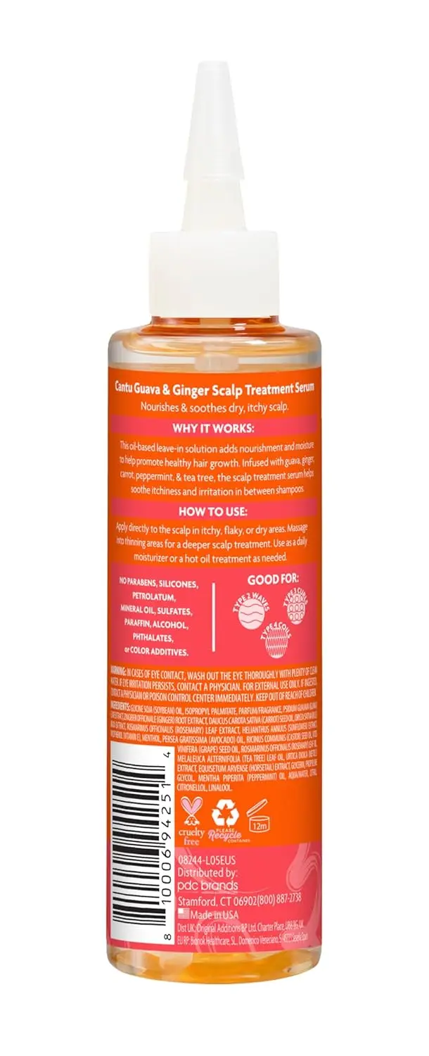 Cantu Guava Ginger Scalp Serum is your revitalizing solution for a healthy, nourished scalp and thriving hair. This lightweight, non-greasy serum is infused with the invigorating power of guava and ginger to stimulate circulation and promote hair growth. Our unique formula is carefully crafted without harsh chemicals, ensuring a gentle yet effective treatment for all hair types. Say goodbye to dry, itchy scalp and hello to stronger, healthier, and more vibrant hair. Experience the difference of a clean, natural, and effective scalp serum with Cantu. This serum soothes and invigorates the scalp, creating an optimal environment for hair growth. Enjoy the natural fragrance and the refreshing sensation as you massage this serum into your scalp. Cantu Guava Ginger Scalp Serum is your daily dose of scalp wellness, leaving your hair feeling refreshed and revitalized. Free of parabens, phthalates, sulfates, mineral oil, and alcohol. A clean formula for a healthy scalp and healthy hair. Give your hair the boost it needs and deserves.
