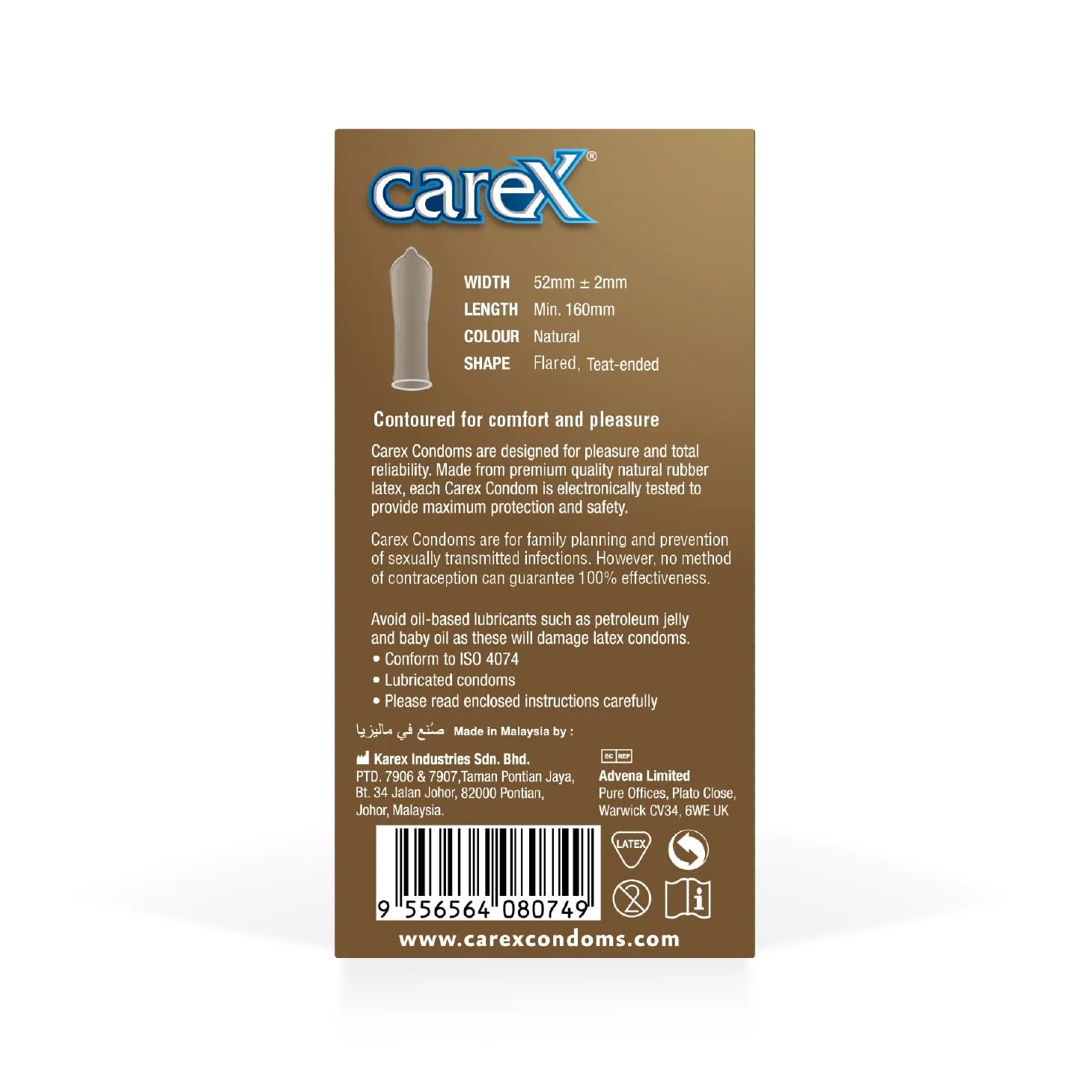 Experience enhanced pleasure and unwavering protection with Carex Comfort Condoms. Designed with your utmost comfort and safety in mind, these condoms offer a superior experience. Each condom is meticulously crafted with a contoured shape that enhances sensitivity and provides a more natural feel. The flared design ensures a secure and comfortable fit, while the teat-ended reservoir tip offers added safety and reduces the risk of slippage. Carex Comfort Condoms are registered with the UAE Ministry of Health, guaranteeing they meet stringent quality standards. Every condom undergoes rigorous electronic testing to ensure its reliability and durability. You can trust Carex Comfort Condoms to provide long-lasting protection, allowing you to enjoy intimate moments with confidence and peace of mind. Choose Carex Comfort Condoms for a pleasurable and safe experience, delivering the protection you need without compromising on comfort or sensitivity. Feel the difference with the carefully designed shape that enhances natural sensations.