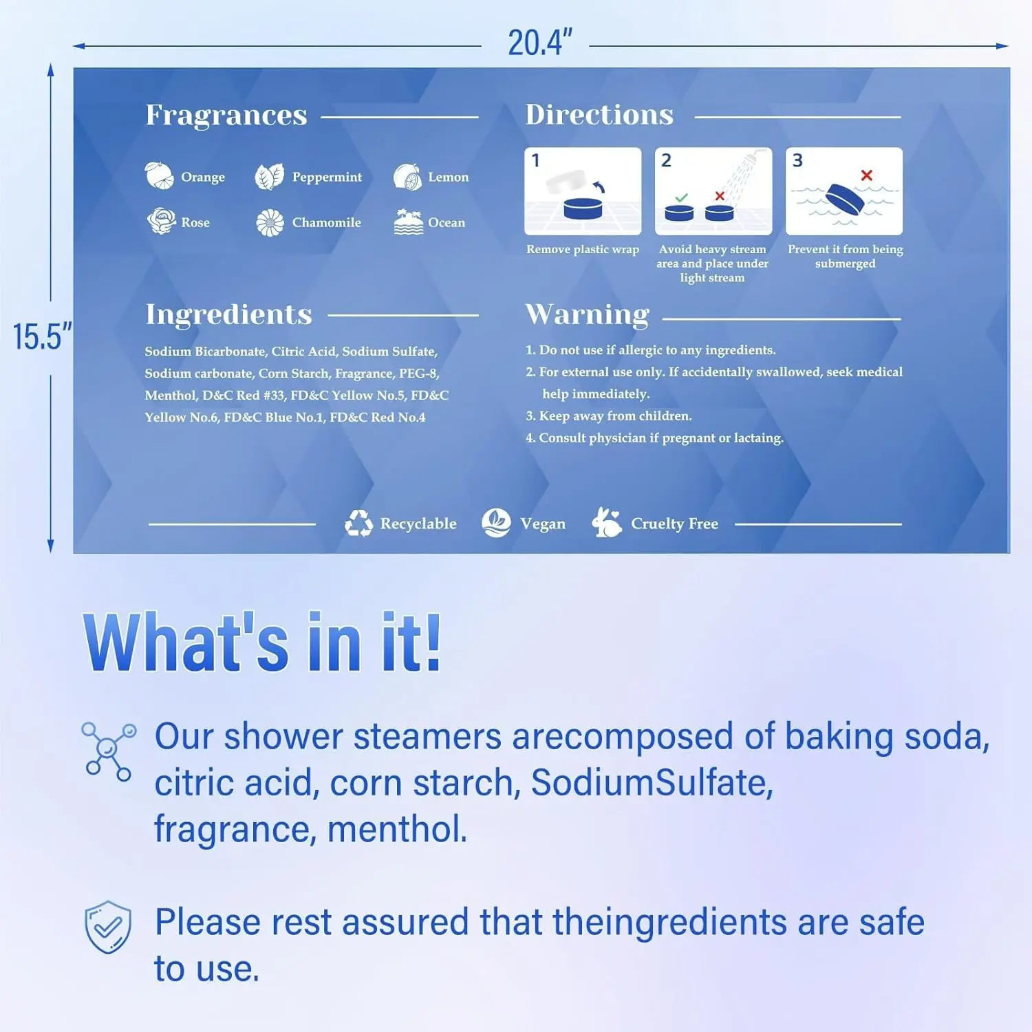 Transform your daily shower into a fragrant oasis with our Cartoon Shower Steamers! This delightful set includes six unique scents, each carefully crafted to invigorate your senses and leave you feeling refreshed. Experience the zesty brightness of Orange, the cool invigoration of Peppermint, the sunny cheerfulness of Lemon, the romantic allure of Rose, the calming serenity of Chamomile, and the breezy freshness of Ocean. Each steamer features a unique cartoon-inspired design, thoughtfully matched to its corresponding scent, adding a touch of whimsy and fun to your shower routine. These playful visuals elevate your shower from a mundane task to a delightful experience. Our shower steamers are designed to deliver a long-lasting fragrance that lingers, enveloping you in a cloud of rich, alluring aroma long after the water stops. Start or end your day on a delightfully fragrant note, feeling rejuvenated and ready to tackle anything. Immerse yourself in a shower of natural and refreshing aromas, meticulously crafted to awaken your senses. These steamers transform your everyday cleanse into a luxurious experience, creating a spa-like atmosphere in the comfort of your own home. These shower steamers are the perfect little but exquisite gift for any occasion. They’re not too expensive, but crafted exquisitely, making them a heartfelt present for loved ones. Consider them for Christmas, Thanksgiving, birthdays, or simply as a token of appreciation. Show someone you care with a gift that elevates their daily routine and brings a touch of joy to their day.