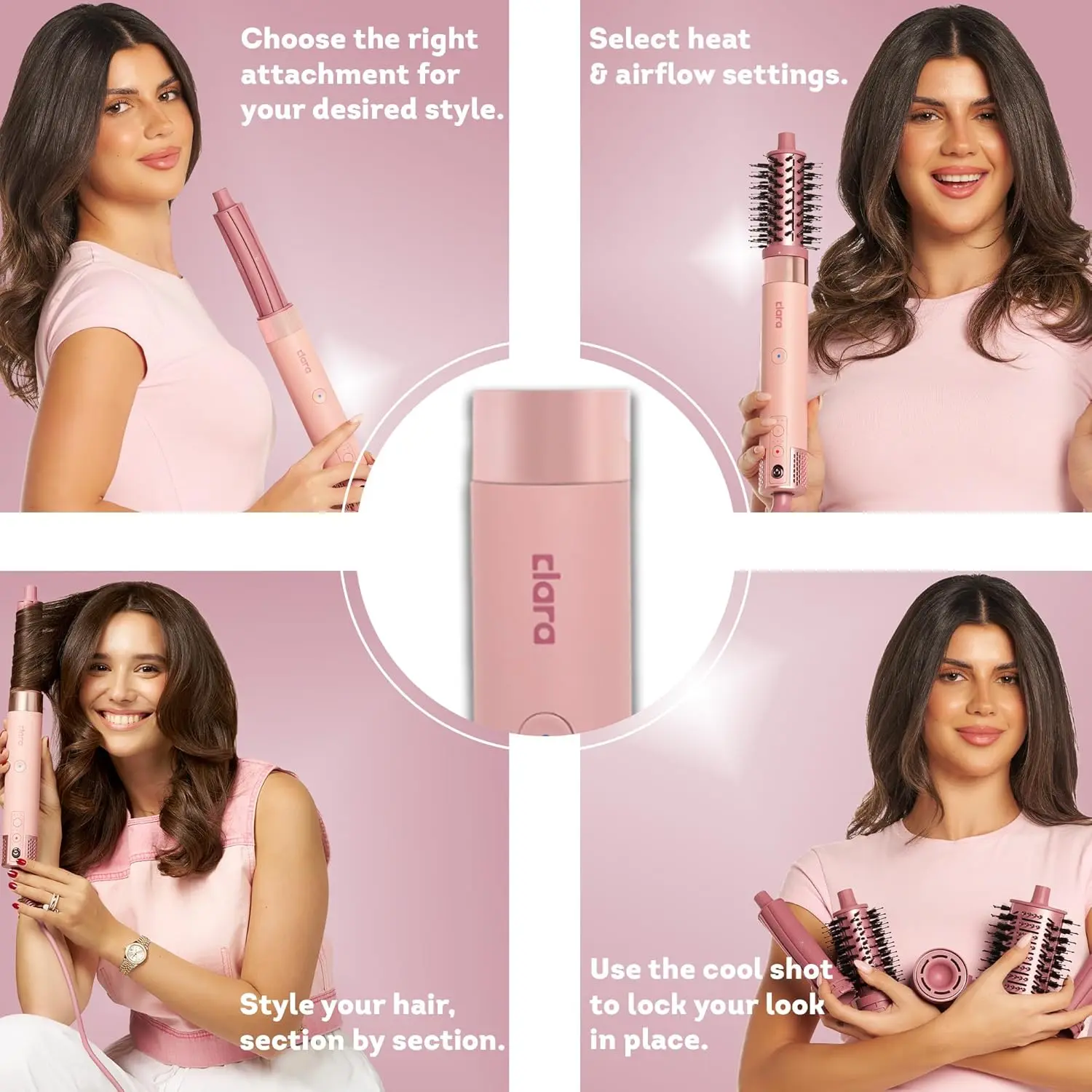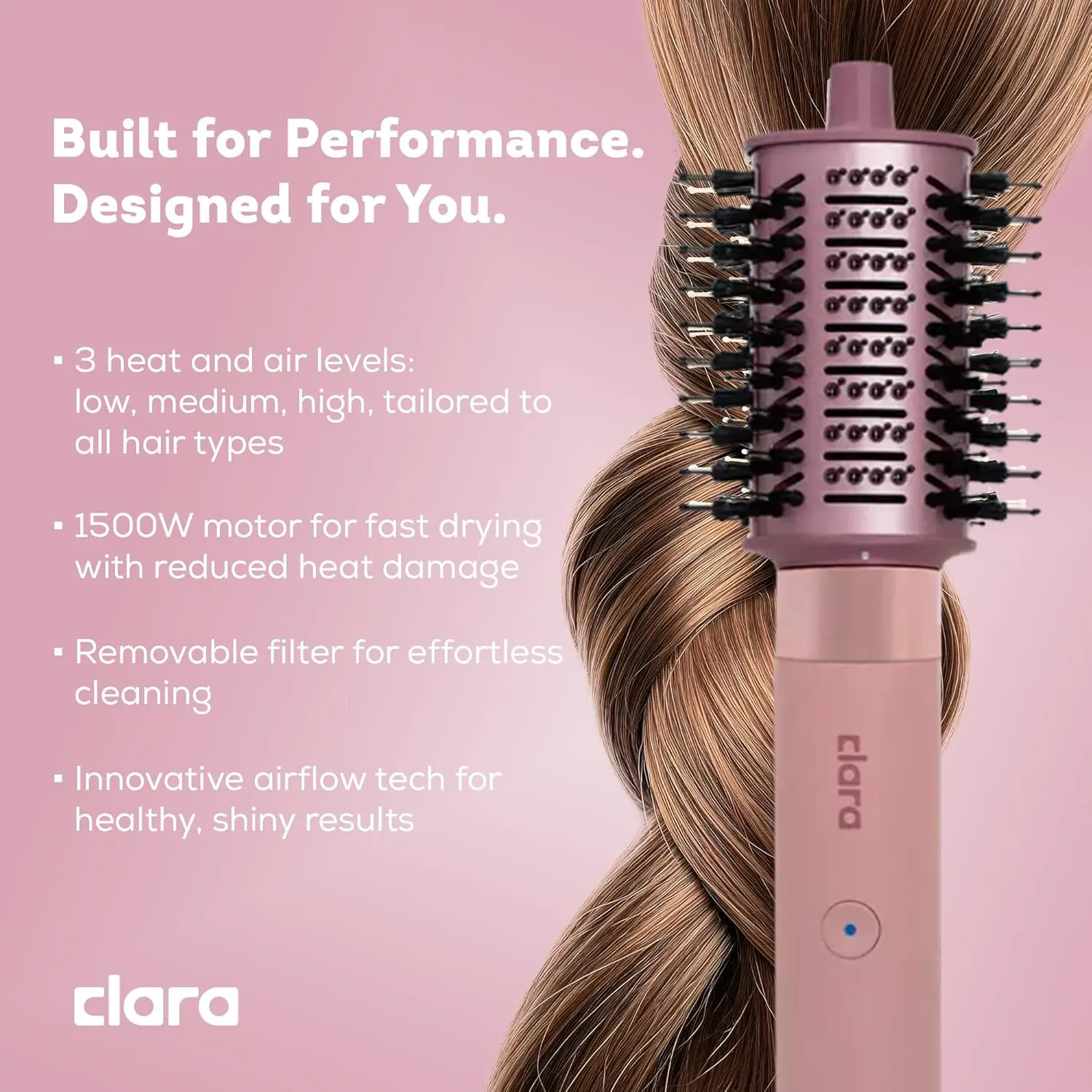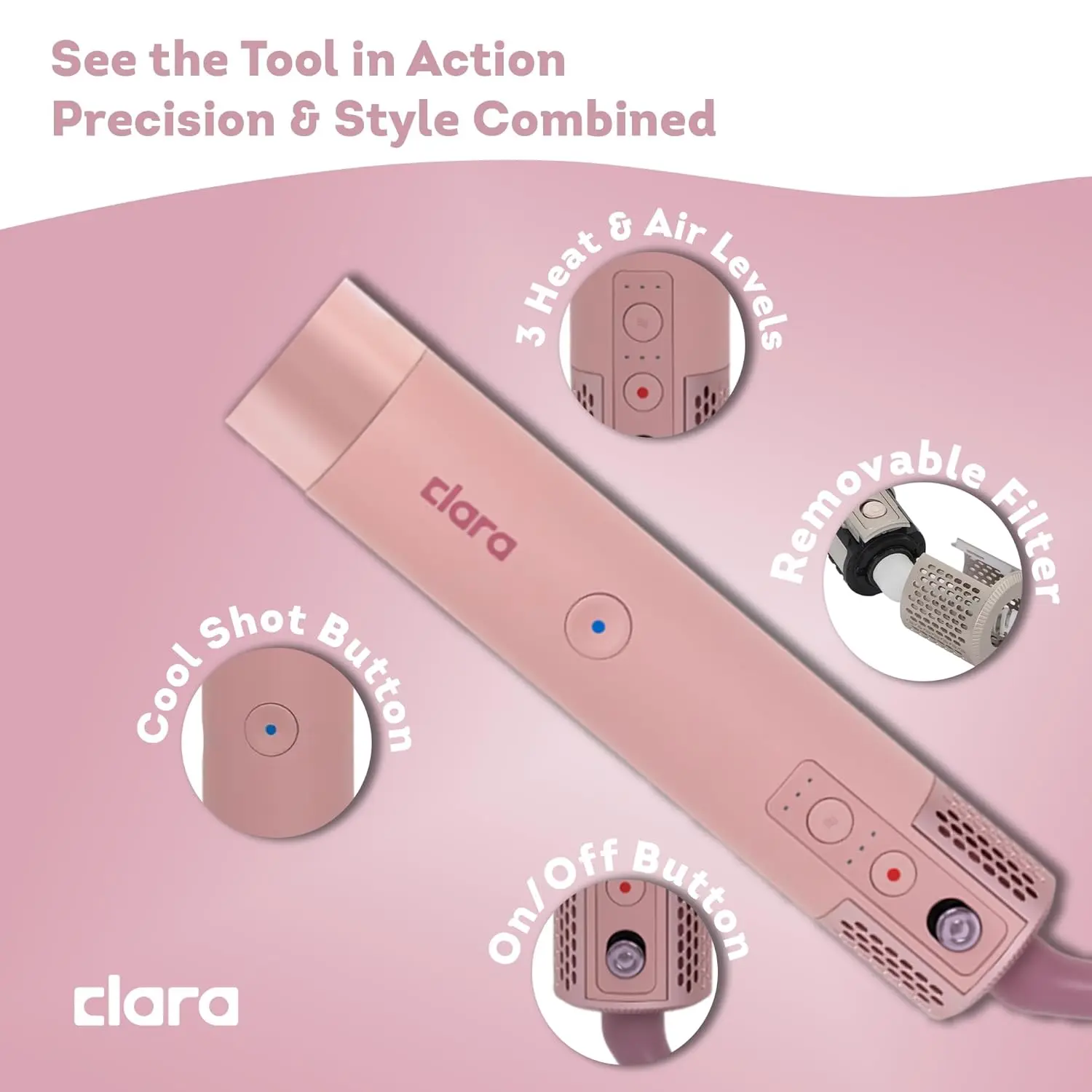 Powered by a robust 1500W motor, the Clara Multi Styler delivers powerful airflow for fast and efficient styling. Customize your styling experience with 3 heat and air levels, suitable for all hair types, from fine and delicate to thick and coarse. The Cold Air Shot function seals the hair cuticle, locking in your style for long-lasting hold and enhanced shine.