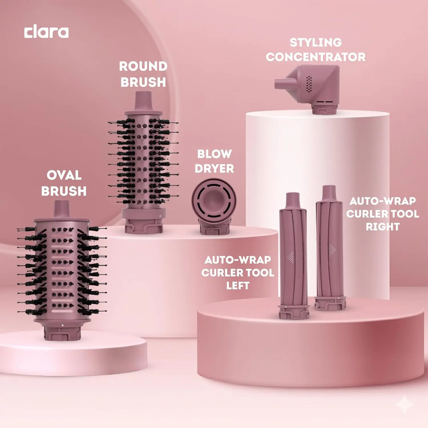 Achieve salon-worthy hairstyles at home with the Clara Multi Styler, your ultimate 6-in-1 hair styling solution! This versatile tool replaces multiple styling devices, saving you time, money, and valuable storage space. Whether you crave bouncy curls, sleek straight locks, or voluminous waves, the Clara Multi Styler empowers you to effortlessly create a variety of stunning looks. The included Styling Concentrator directs airflow for precise styling, while the Blow Dryer attachment quickly dries your hair. Experience effortless curls with the Auto-Wrap Curlers (Left & Right), designed to wrap your hair automatically for perfect, consistent curls every time. Use the Round Brush to add volume and bounce, or the Oval Brush for smooth, sleek styles and gentle detangling.