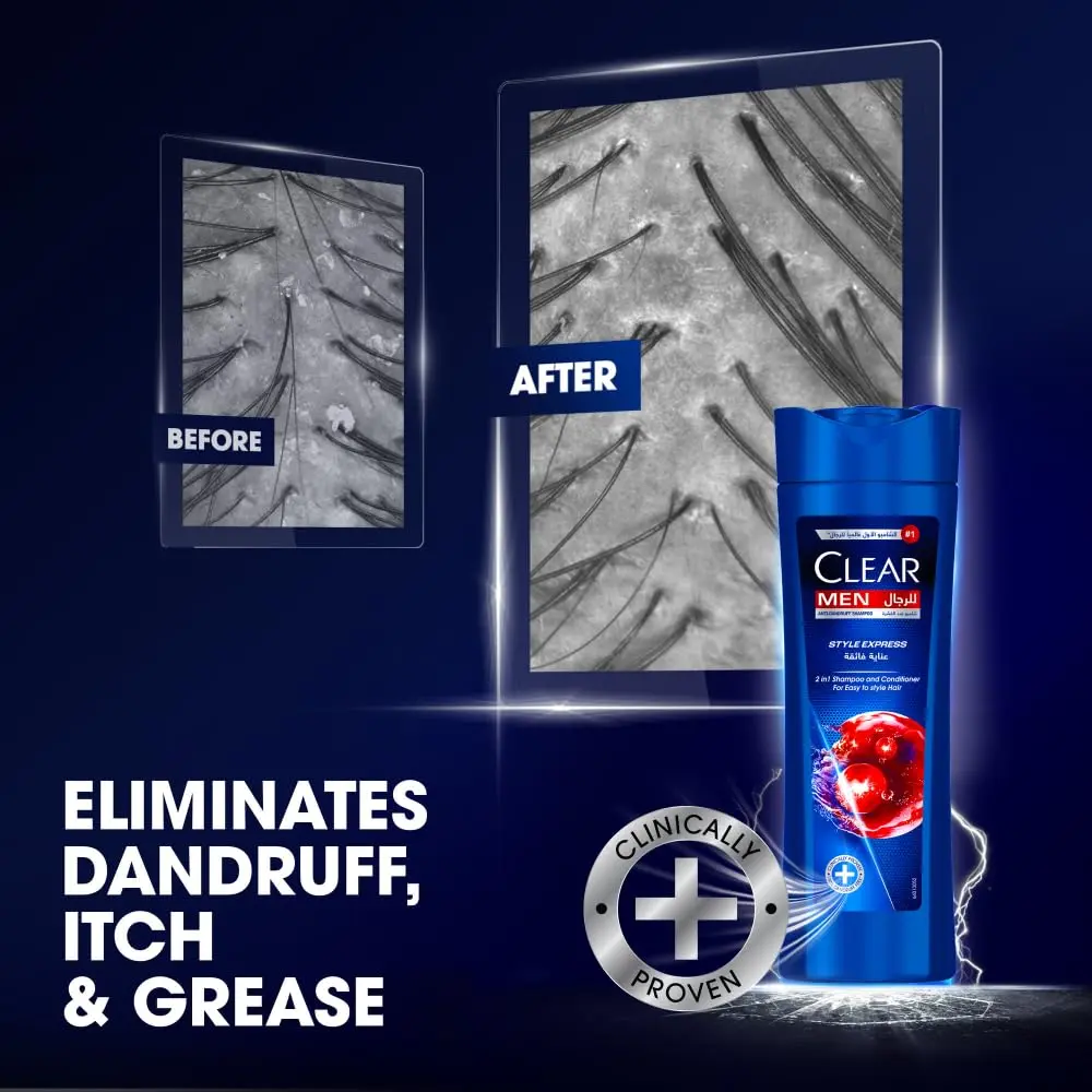 Introducing the revamped CLEAR Men 2in1 Anti Dandruff Shampoo & Conditioner, Style Express! This revolutionary formula is designed specifically for men’s scalps, which are more prone to dandruff. Get ready to experience 100% dandruff-free hair and a nourished scalp with our clinically proven anti-dandruff formula. Enriched with vitamin B3 and glycerin, this 2in1 shampoo and conditioner not only eliminates dandruff but also makes your hair incredibly easy to style. Say goodbye to bad hair days and hello to effortless styling! CLEAR Men Shampoo is the world’s number 1 men’s shampoo*, trusted by millions worldwide. Our formula is infused with a potent blend of nourishing ingredients, designed to strengthen your scalp and promote healthy hair growth. Don’t let dandruff hold you back – explore the full CLEAR hair care range and discover the perfect shampoo for your unique hair and scalp needs. Whether you’re dealing with dryness, oiliness, or sensitivity, CLEAR has a solution to help you achieve a healthier, stronger scalp. Upgrade your hair care routine with the NEW CLEAR Men 2in1 Anti Dandruff Shampoo & Conditioner, Style Express, and experience the difference!