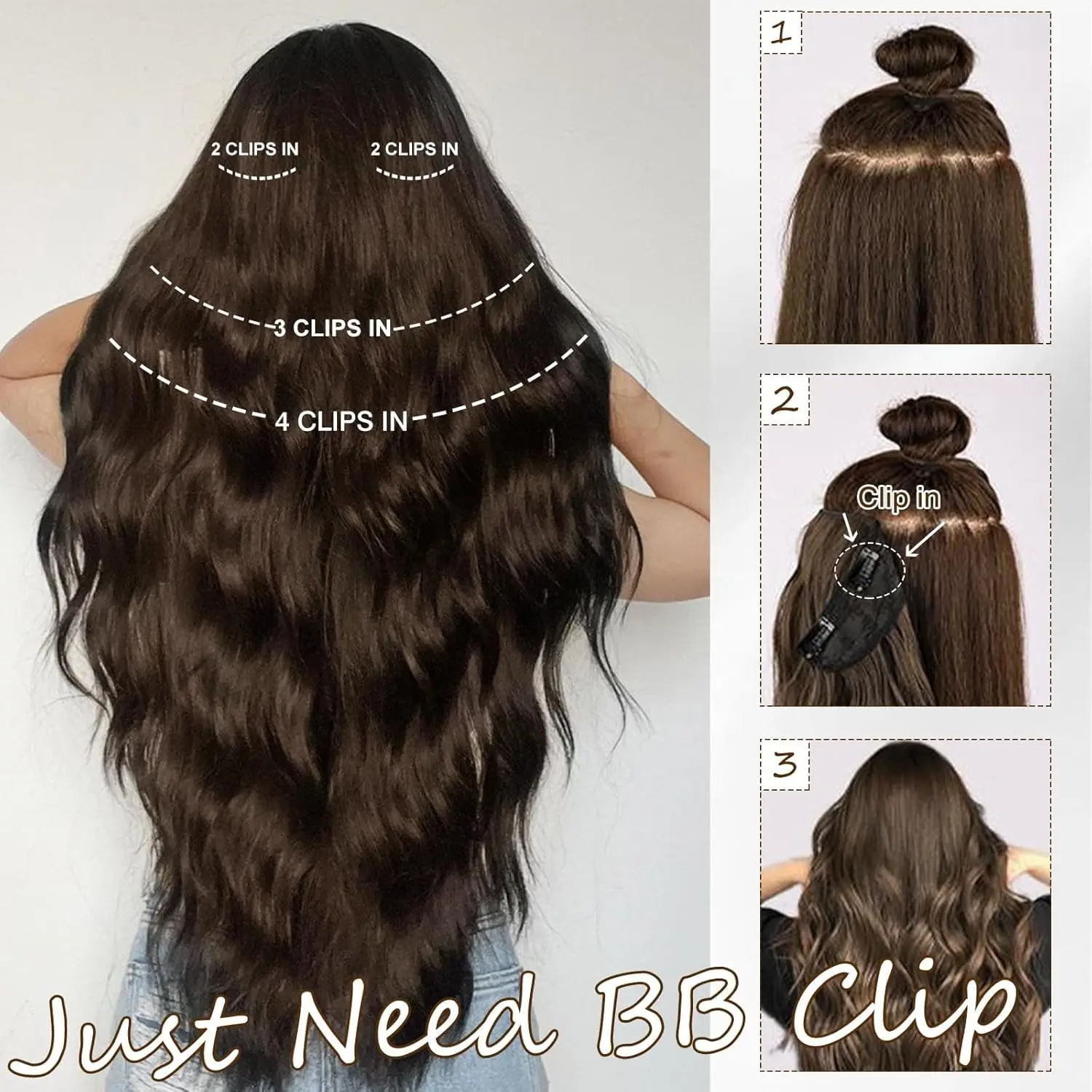 Transform your look in minutes with our Clip In Hair Extensions! These 4-piece wavy black extensions are the perfect solution for adding volume and length to your hair without the commitment of traditional extensions. Unlike permanent options that can damage your hair, our clip-in extensions are gentle and easy to use. They attach securely with BB clips, causing no pressure or damage to your scalp. Whether you’re getting ready for a party, a special event, or just want to elevate your everyday style, these extensions will give you a charming and elegant look in just 5 minutes.