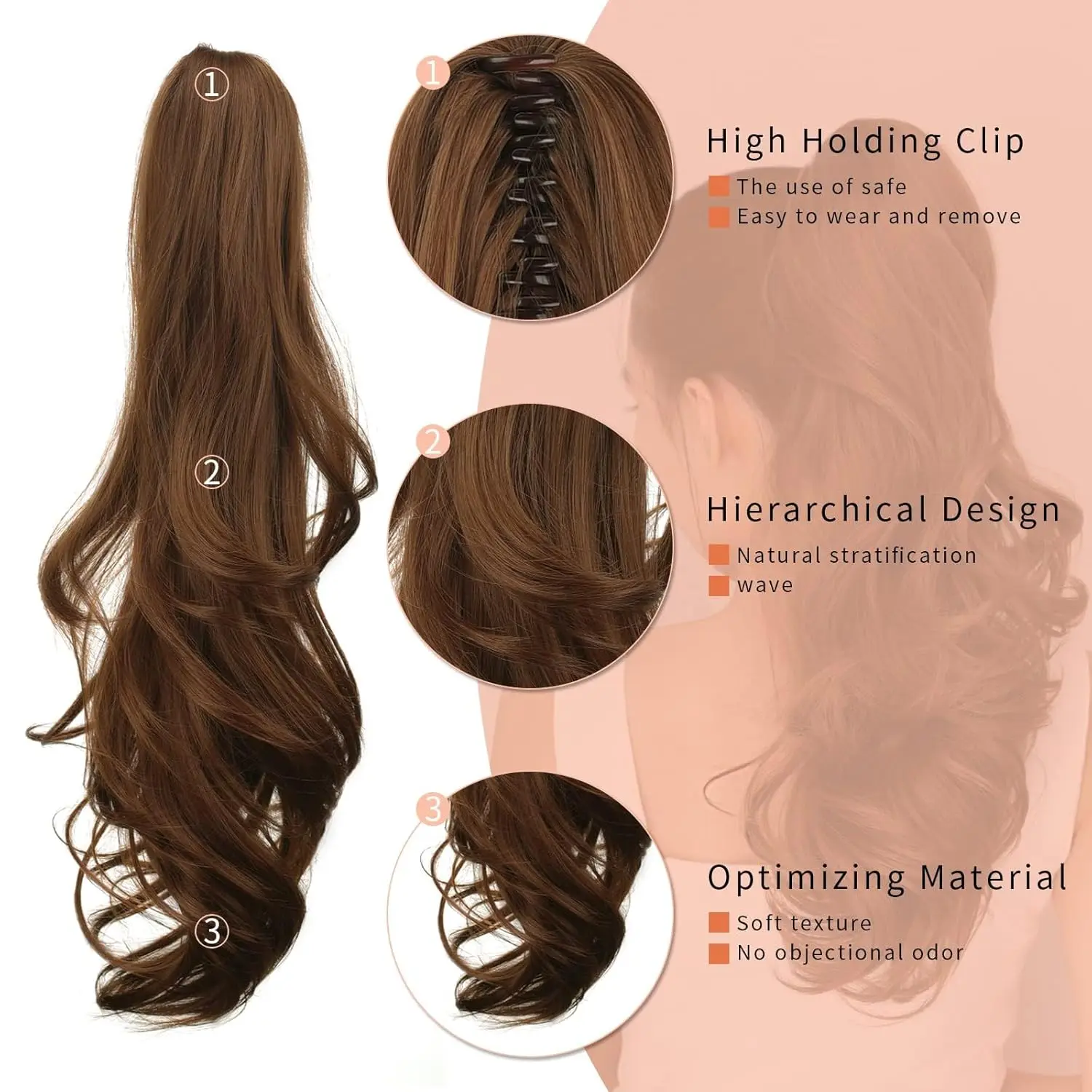 Transform your look instantly with this Clip in Ponytail Extension Curly Long Hairpiece in Brown! Achieve a stunning, voluminous hairstyle in just seconds with its easy-to-use clip-in design. Perfect for adding length and fullness to medium to thin hair, this extension is even suitable for those with shorter hair looking to experiment with longer locks. This ponytail extension blends seamlessly with your natural hair for a smooth and natural appearance. Crafted from high-quality synthetic fibers, this hairpiece offers a soft, fluffy texture that feels comfortable against your skin. The extension is heat-resistant, allowing you to style it with temperatures up to 200℃, giving you the freedom to create various looks without compromising its quality. At 20 inches long and 5.6 OZ, it's lightweight enough for comfortable daily wear yet substantial enough to make a noticeable impact for special occasions. Applying the extension is a breeze – simply open the claw comb and clip it over your own bun or ponytail for an instant upgrade. Maintaining the extension is easy too; gently brush it with a wide-tooth comb to prevent tangling and keep it looking its best. Experience the convenience and beauty of this clip-in ponytail extension and elevate your hairstyle effortlessly! This is your secret weapon for achieving red-carpet worthy hair in a snap.