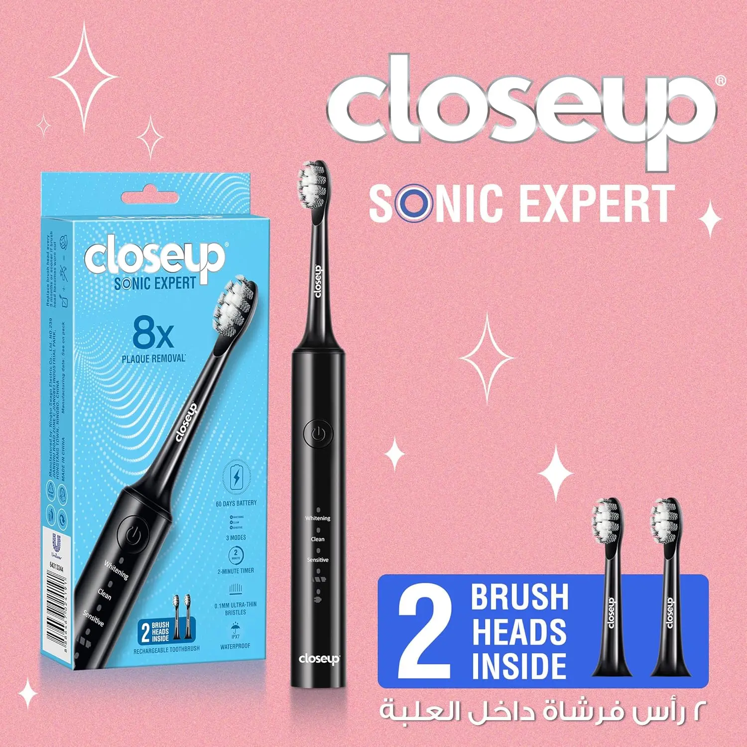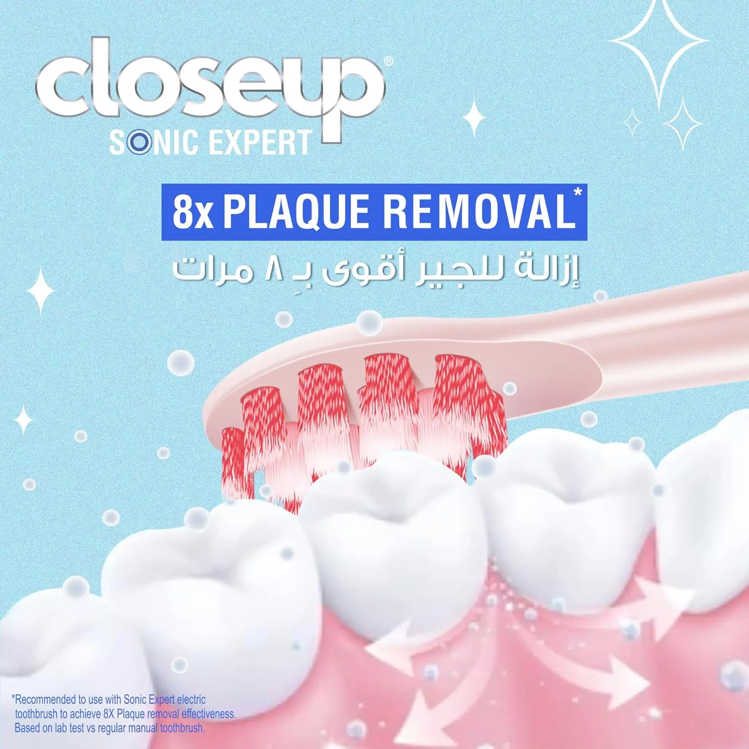 Experience a superior clean with the closeup Sonic Expert Rechargeable Toothbrush. This advanced electric toothbrush utilizes sonic wave technology, delivering 30,000 vibrations per minute for 8x more plaque removal compared to a manual toothbrush. Customize your oral care with 3 unique brushing modes: whitening, clean, and sensitive, catering to your individual needs and preferences. The toothbrush is designed for optimal hygiene, featuring an IPX7 waterproof rating, making it safe to use in the shower or at the sink. Enjoy uninterrupted use with an exceptional 60-day battery life on a single charge. The gentle yet effective cleaning power comes from the 0.1mm ultra-thin bristles, which are gentle on your gums and teeth while thoroughly eliminating plaque and debris. Achieve dentist-recommended brushing habits with the built-in 2-minute smart timer, ensuring you brush for the optimal duration. This comprehensive kit includes everything you need to get started: 1 electric toothbrush handle, 2 toothbrush heads, and 1 charging lead. Upgrade to the closeup Sonic Expert Rechargeable Toothbrush for a healthier, brighter smile and a truly exceptional oral care experience. Feel the difference of a deeply cleaned mouth with every use.