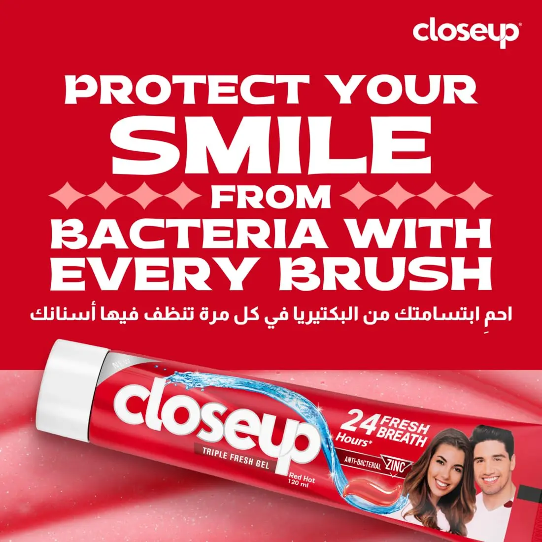 Experience the ultimate in fresh breath and oral hygiene with Closeup Triple Fresh Red Hot Toothpaste. This powerful gel toothpaste delivers a 3-in-1 action, leaving your mouth feeling incredibly clean, protected, and refreshed. The unique triple action formula works tirelessly to combat bad breath and maintain a healthy oral environment. Enjoy the confidence of knowing your breath stays fresh for up to 24 hours thanks to our clinically proven technology with twice daily brushing.