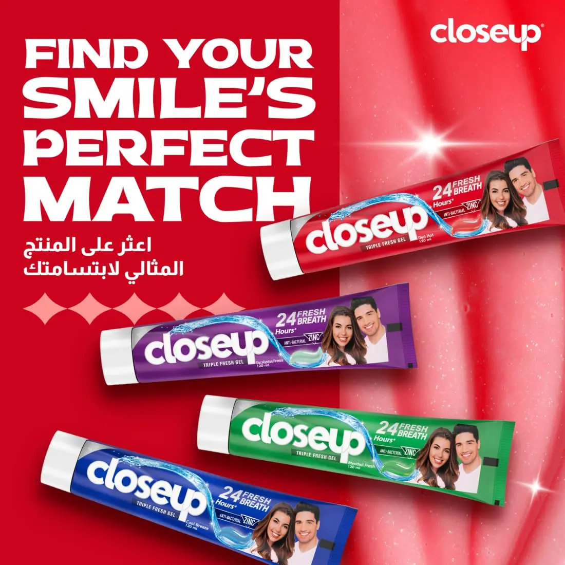 Beyond Red Hot, Closeup Triple Fresh Gel Toothpaste is available in three other delicious flavors: Cool Breeze, Eucalyptus, and Menthol Fresh. Explore the full range to discover your perfect flavor and enjoy the benefits of long-lasting fresh breath and superior oral hygiene.