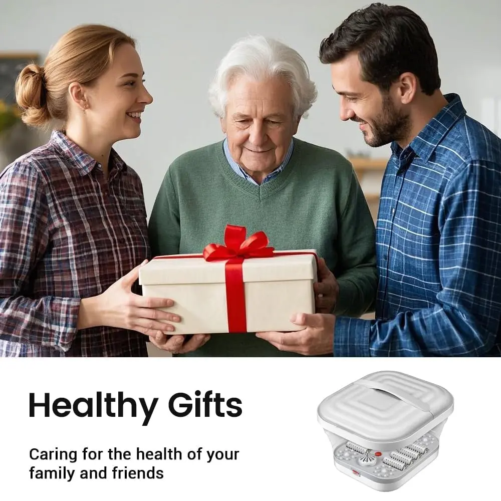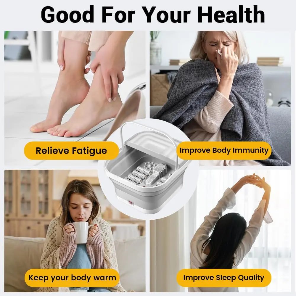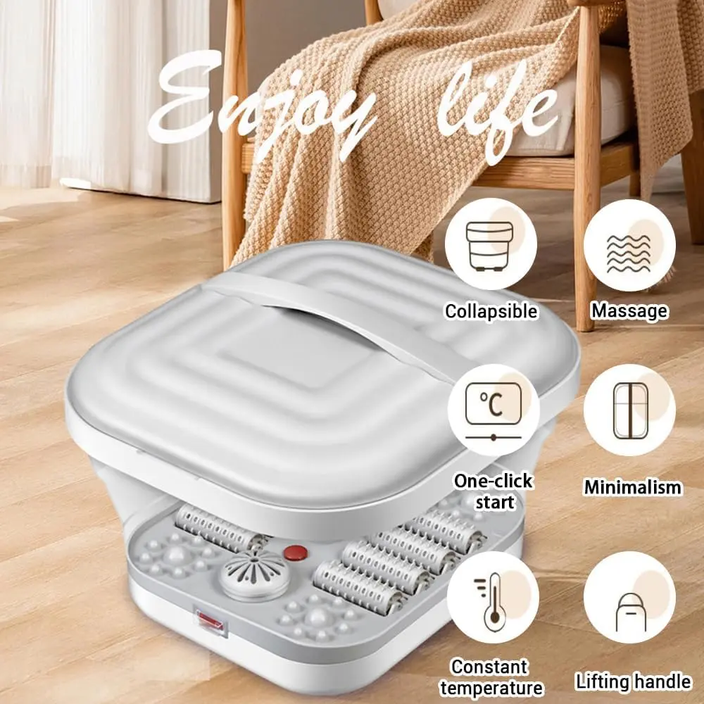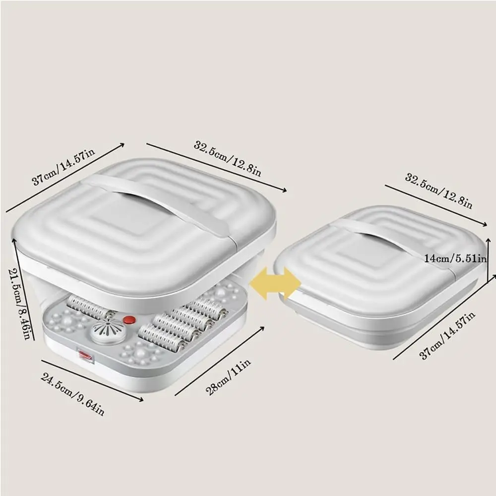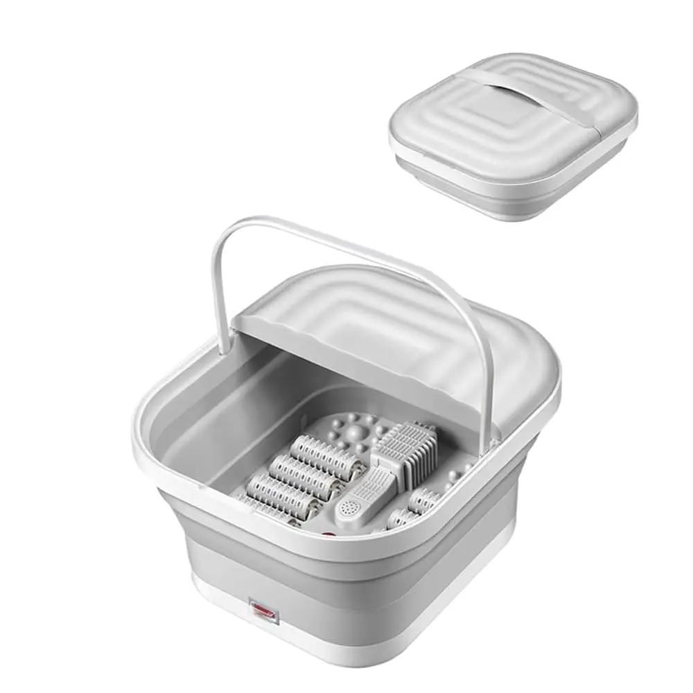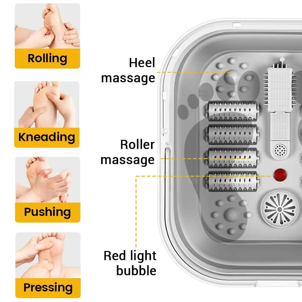 Indulge in the ultimate relaxation experience with our Collapsible Foot Spa Bath with Heat & Massage! This innovative foot spa combines smart heating technology, advanced massage, and a convenient foldable design to bring the spa to your home. Enjoy personalized foot care with the included pedicure set, neatly packed in a durable plastic case. The built-in red light technology ensures optimal hygiene during each foot soak session. Experience the luxury of an at-home spa with our premium-quality materials and meticulous design. Safety is paramount with our double-layer insulated heating technology, completely separating water and electricity for a worry-free experience. The rapid yet secure heating process delivers consistent warmth. Relieve foot fatigue with our eight precision-designed massage wheels, expertly targeting acupoints for a professional-grade massage simulation. The detachable wheels facilitate effortless cleaning, maintaining a pristine and hygienic foot spa environment. Our foldable design makes storage a breeze, perfect for small apartments or limited spaces. Enjoy a serene and immersive spa journey with our whisper-quiet operation. The innovative dual-wave technology delivers a soothing, consistent stream of warm water, enabling deep relaxation without disruptive sounds. This foot spa is the impeccable choice for home unwinding, offering a luxurious and convenient way to care for your feet. The accompanying pedicure set provides everything you need for complete foot care.