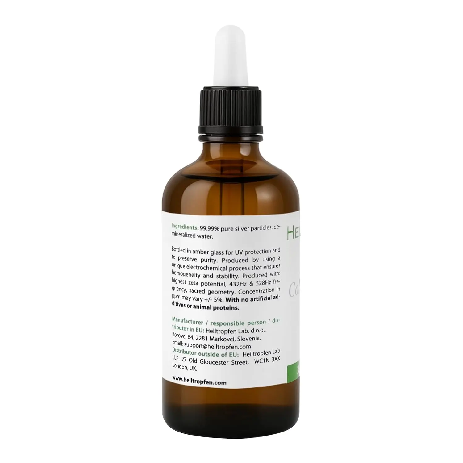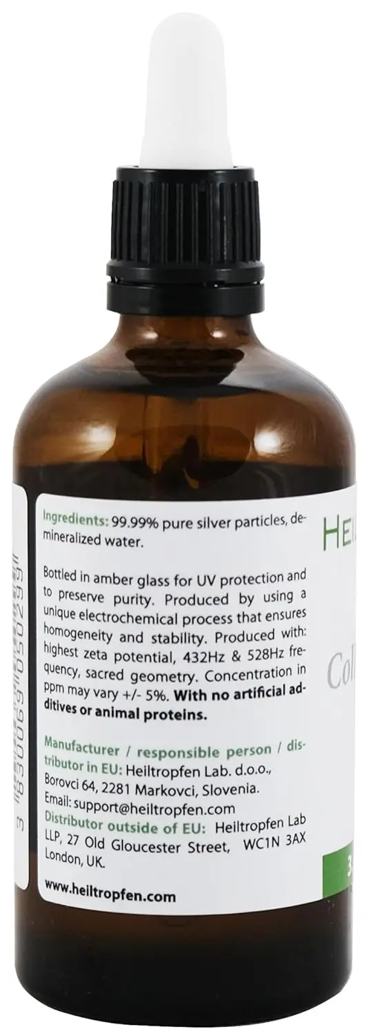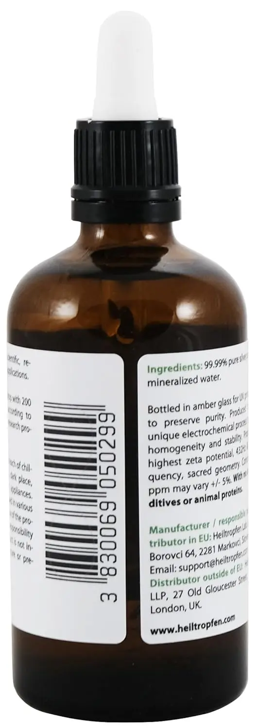 Experience the power of pure colloidal silver with our premium 30ppm solution. Crafted with meticulous care, our Colloidal Silver is made using 99.998% pure silver particles, ranging in size from 1 to 20 nanometers. These ultra-fine particles are suspended in pharma grade distilled water (Ph.Eur.), ensuring the highest quality and purity. Our commitment to excellence means you won’t find any artificial additives or animal proteins in our product. We believe in providing a natural and effective solution, harnessing the inherent properties of silver. Each bottle is carefully packaged in a glass bottle with a convenient pipette for easy and precise dispensing. Discover the difference that purity makes with our Colloidal Silver, your trusted source for high-quality silver solutions. This 100ml bottle is perfect for daily use and ensures you always have this natural product on hand.