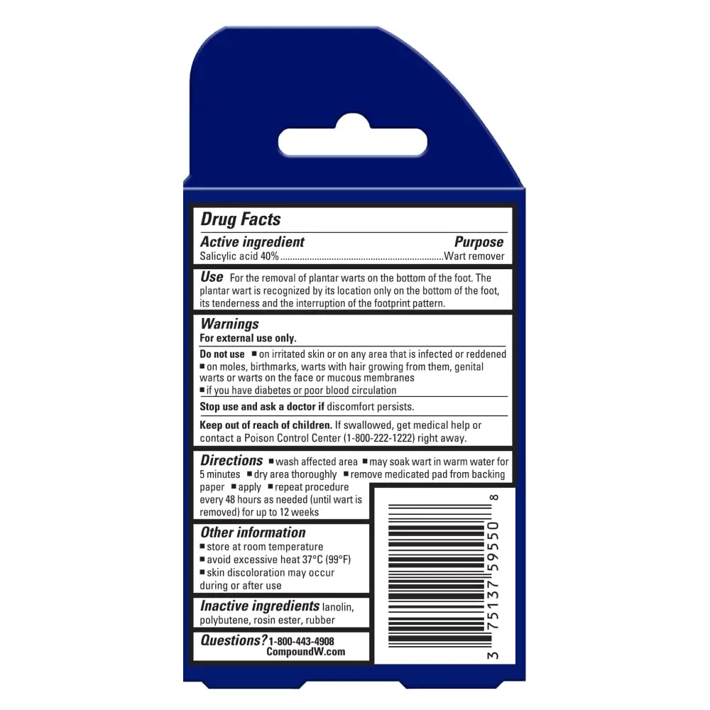 Compound W Plantar Wart Remover Pads offer an effective and convenient solution for eliminating stubborn plantar warts. These medicated pads provide targeted treatment, delivering the active ingredient directly to the wart while protecting the surrounding healthy skin. The cushioning design offers immediate pain relief and comfort, allowing you to go about your day without discomfort. Compound W is the #1 pharmacist-recommended brand for wart removal, trusted by millions for its proven efficacy. These pads are easy to apply and stay in place, ensuring consistent treatment. They are discreet and allow you to wear socks and shoes comfortably. By using Compound W Plantar Wart Remover Pads you can confidently remove plantar warts at home. These pads help to soften and gradually remove the wart. Compound W provides a convenient and effective way to address plantar warts, and you can trust the brand that pharmacists recommend the most. With Compound W, you can take control of your foot health and regain comfort and confidence. The advanced formula penetrates deep to eliminate the wart at its source, preventing recurrence. Experience the relief and effectiveness of Compound W Plantar Wart Remover Pads today.