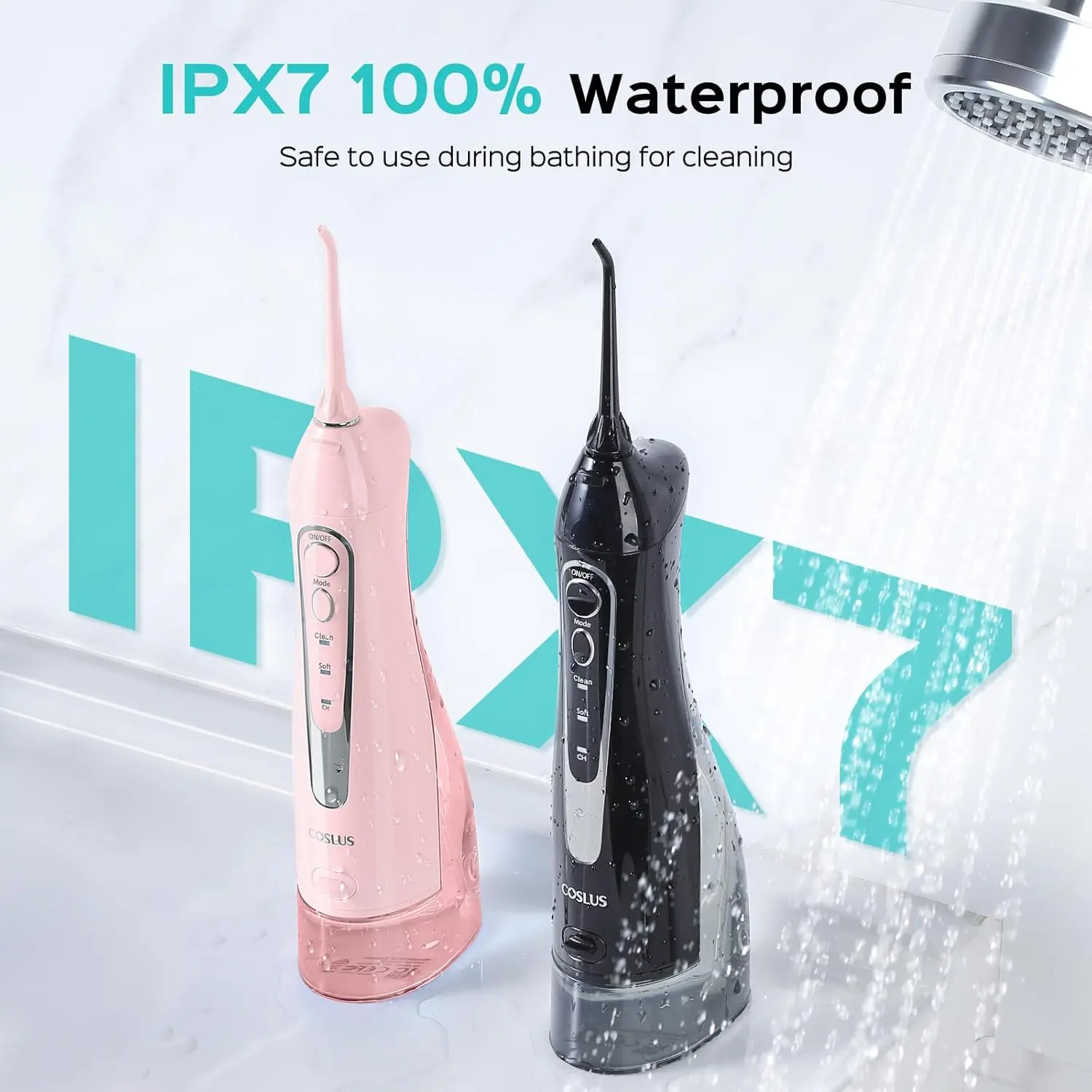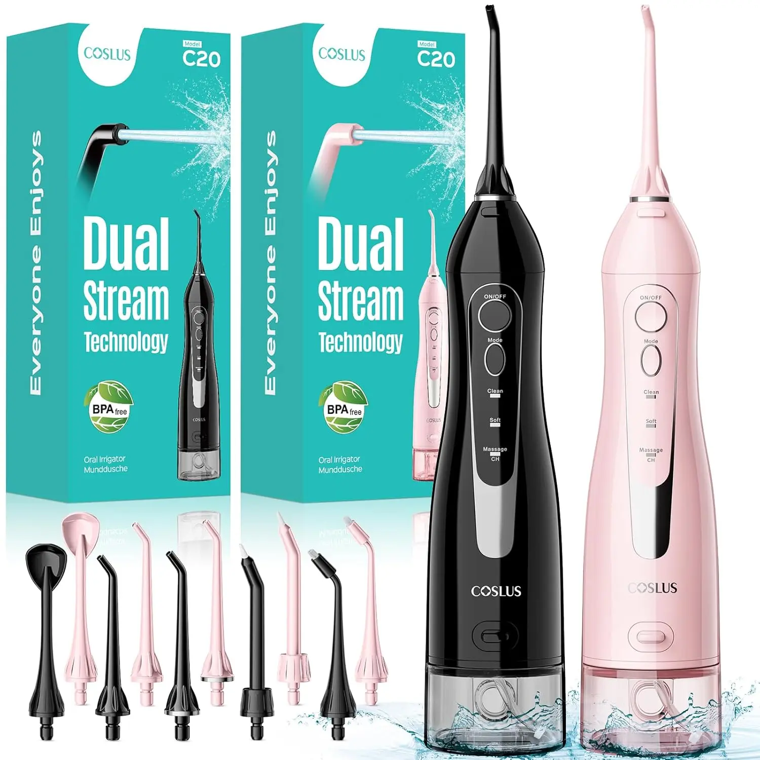 Achieve a healthier, brighter smile with the COSLUS C20 Water Flosser 2 Pack! This powerful and portable cordless oral irrigator provides comprehensive oral care, effectively removing plaque and debris from hard-to-reach areas. Recognized by American dental experts, the COSLUS C20 is your personal oral health butler, helping you say goodbye to bad breath and gingivitis. Featuring dual water flow and delivering up to 1,800 water pressure pulses per minute, it ensures a thorough and refreshing clean. The upgraded 300ml large-capacity detachable water tank makes refilling and cleaning a breeze, while the non-slip handle offers a secure grip. Safe for bathroom use with its IPX7 waterproof design, this water flosser is built to last with an upgraded metal motor that provides years of reliable performance. Comes with 5 nozzles to meet everyone’s oral care needs. Enjoy up to 30 days of use on a single 3-hour charge, making it perfect for home, travel, and business trips. Its ergonomic design and compact, lightweight build make it easy to carry wherever you go, ensuring your teeth stay bacteria-free and your oral health is always a priority. Gentle yet effective, the COSLUS C20 features multiple operating modes and pressure settings, making it suitable for those with braces or sensitive teeth. It even massages the gums, promoting healthy circulation. Effortlessly switch between modes to customize your cleaning experience and achieve a deeper, more effective clean. The COSLUS C20 is a thoughtful choice for caring for your family’s oral health, providing a simple and safe way to maintain a healthy and confident smile.
