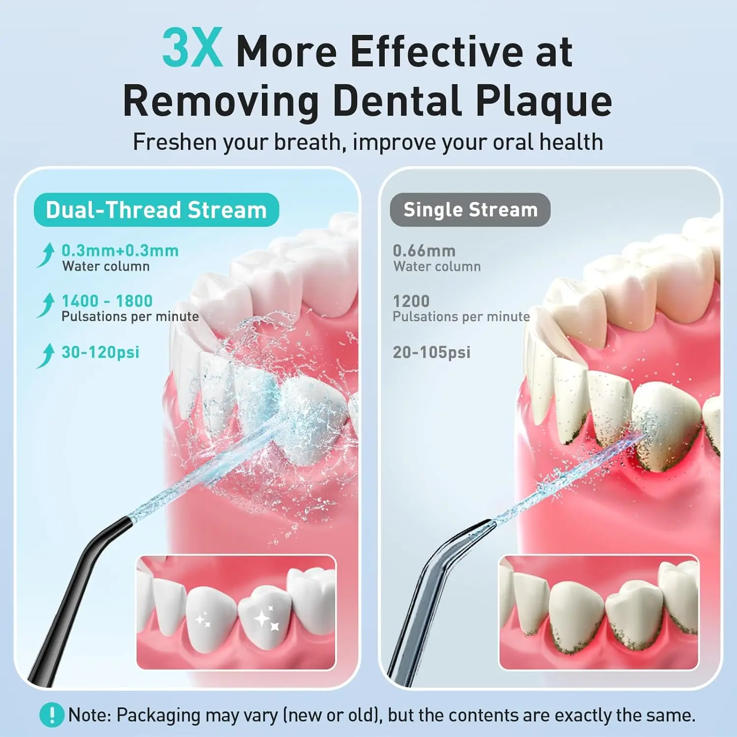Experience a superior clean with the COSLUS C20 Water Flosser! This advanced oral hygiene device utilizes ultra-fine, double-threaded water jet pulsation technology to effectively remove 3X more dental plaque than traditional brushing. Say goodbye to bad breath and tooth decay with 1400-1800 pulsations per minute that deeply clean between teeth and below the gumline. The COSLUS C20 offers three classic modes, allowing you to customize your cleaning experience and even massage your gums for improved circulation. It’s perfect for everyone, including those with braces, adults, and teenagers. The large 300ml detachable water tank ensures thorough cleaning without constant refills, and the wide-mouth design makes adding water and cleaning a breeze. The non-slip handle provides a comfortable and secure grip. With an IPX7 waterproof design, you can confidently use it in the shower. The upgraded metal motor provides reliable high-pressure water pulsation for up to 3 years. Enjoy up to 30 days of use on a single 3-hour charge, making it ideal for home, travel, and business trips. Its compact and lightweight design makes it easy to carry and store. The COSLUS C20 water flosser is gentle and safe for sensitive teeth and gums, thanks to its multiple operating modes and pressure settings. It’s a thoughtful way to care for your family’s oral health.