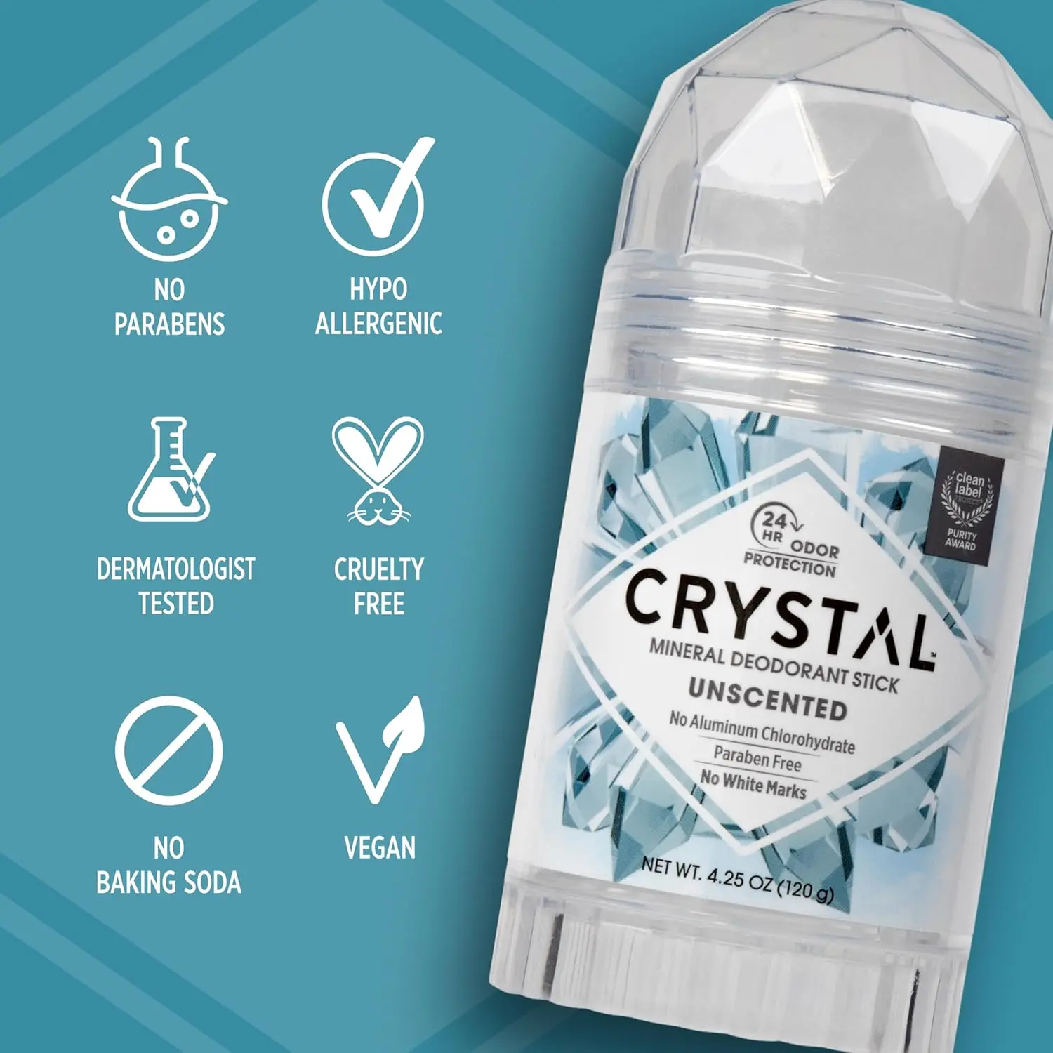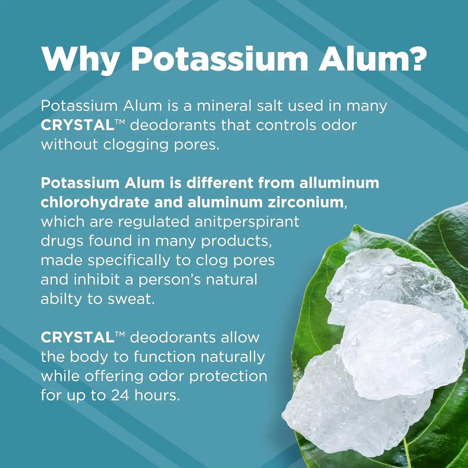 Discover the original and still the best natural deodorant with CRYSTAL Deodorant Stick! For 35 years, CRYSTAL has been the pioneer in mineral salt deodorants, providing naturally-derived, one-ingredient odor protection. Unlike conventional deodorants that clog pores, CRYSTAL allows your body to function naturally while effectively controlling odor for up to 24 hours with the power of natural minerals. We are proud to be the only deodorant brand to receive the Clean Label Project Purity Award for ALL of our deodorants, guaranteeing that we never use harsh chemicals like aluminum chloride, parabens, sulfates, phthalates, artificial fragrances, or colors.