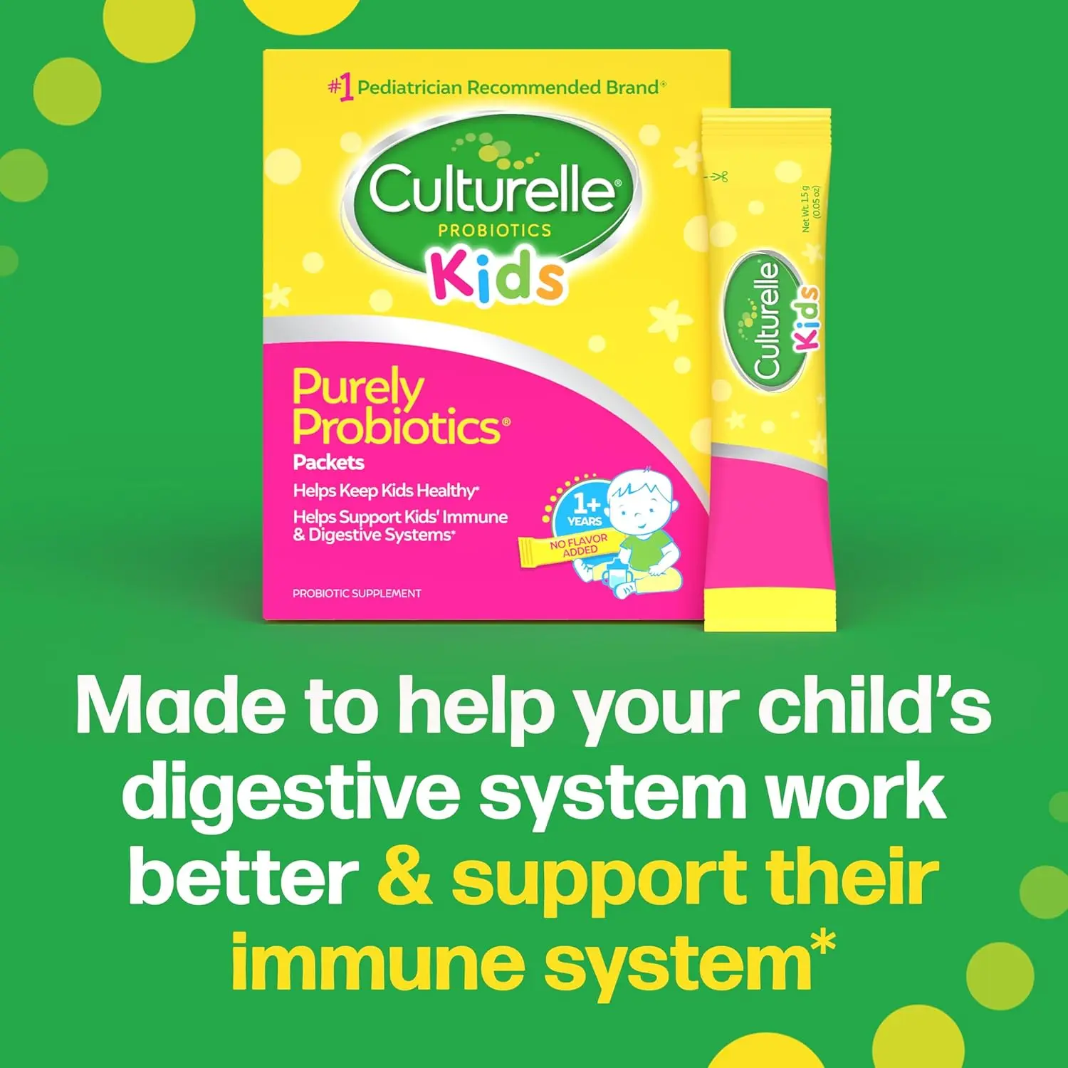 Culturelle Kids Probiotics Packets are a safe and effective way to support your child’s digestive and immune health. Each packet contains Lactobacillus GG, the #1 clinically studied probiotic strain in children. Lactobacillus GG helps to restore the natural balance of good bacteria in your child’s digestive tract, which can be disrupted by diet, stress, travel, and some medications. Culturelle Kids Probiotics can help to reduce occasional digestive upset, including diarrhea and constipation. They also help to support a healthy immune system by promoting the growth of beneficial bacteria in the gut, where 70% of the body’s immune system resides. Culturelle Kids Probiotics Packets are easy to administer; simply mix one packet into your child’s favorite cold food or beverage. They are sugar-free, gluten-free, dairy-free, and non-GMO. With regular use, Culturelle Kids Probiotics can help keep your child healthy and happy. Culturelle is a trusted brand recommended by pediatricians. Choose Culturelle to support your little one’s well-being and provide them with the beneficial bacteria they need for a healthy gut and a strong immune defense. The individual packets ensure freshness and accurate dosage, making it convenient for parents to use at home or on the go. Give your child the gift of a healthy gut with Culturelle Kids Probiotics.