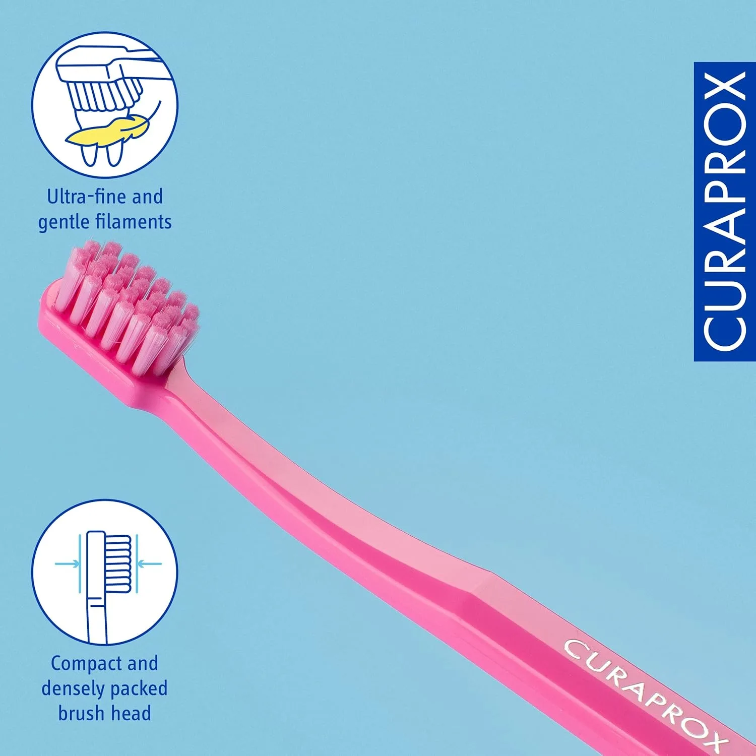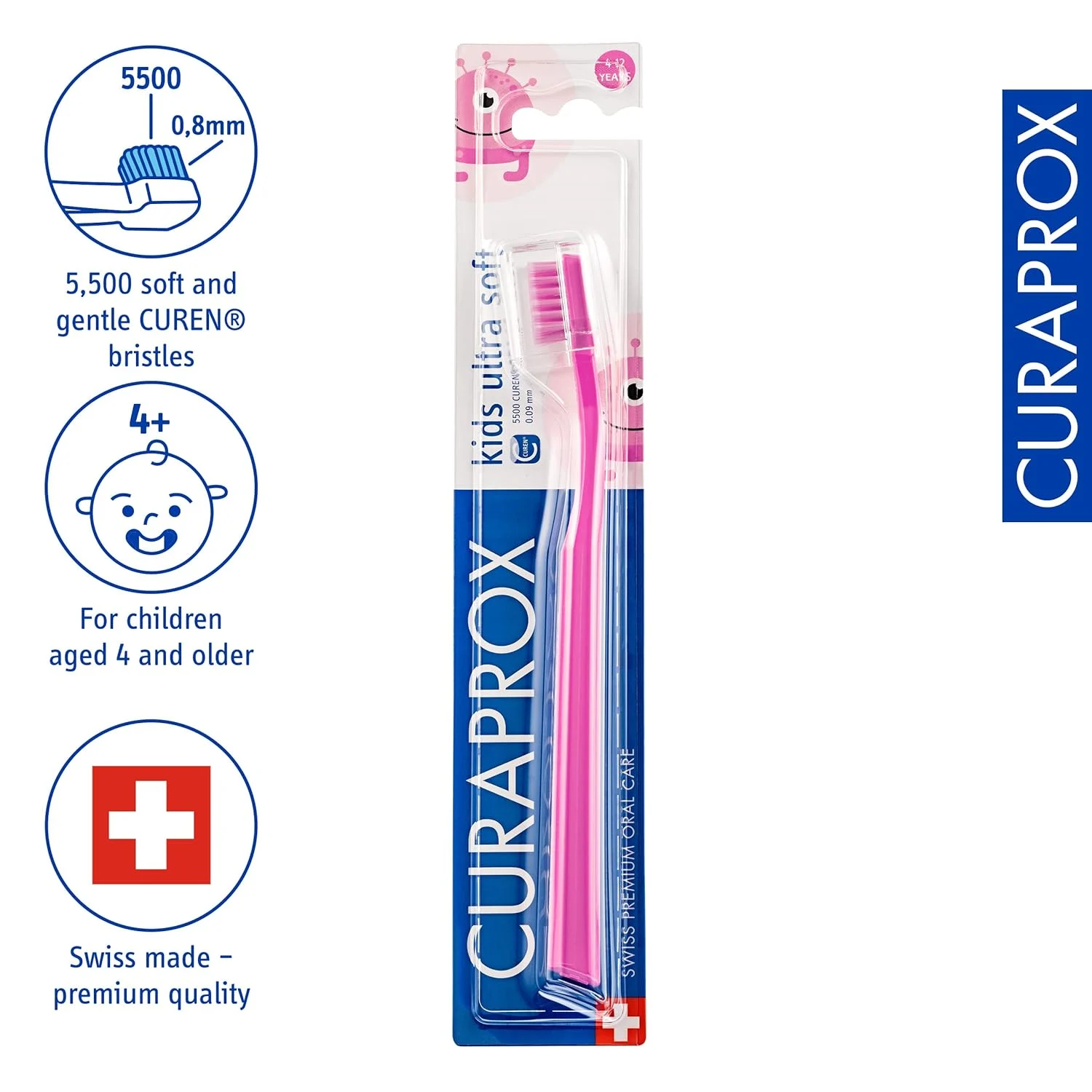 The Curaprox Kids Toothbrush in Pink makes brushing fun and effective for children ages 4 to 12. Featuring 5,500 ultra-soft CUREN bristles, this toothbrush provides a gentle yet thorough clean, removing plaque without irritating sensitive gums. The ergonomic octagonal handle is designed for small hands, ensuring a comfortable grip and the correct angle for optimal cleaning. Each bristle is incredibly fine, measuring only 0.09mm in diameter, creating a dense and efficient brushing surface that is gentle on delicate gums. Engineered with Swiss precision, this durable toothbrush is built to last, offering a reliable and safe brushing experience. The vibrant pink color adds an element of fun, encouraging kids to brush consistently and making “brush hour” a favorite part of their day. The Curaprox Kids Toothbrush transforms oral hygiene into an enjoyable routine, setting the foundation for a lifetime of healthy smiles. Give your child the best start to dental care with this ultra-soft and effective toothbrush. Its gentle action is perfect for protecting young gums while effectively cleaning away plaque. This toothbrush helps establish good oral hygiene habits early on, making brushing a positive experience for your child.