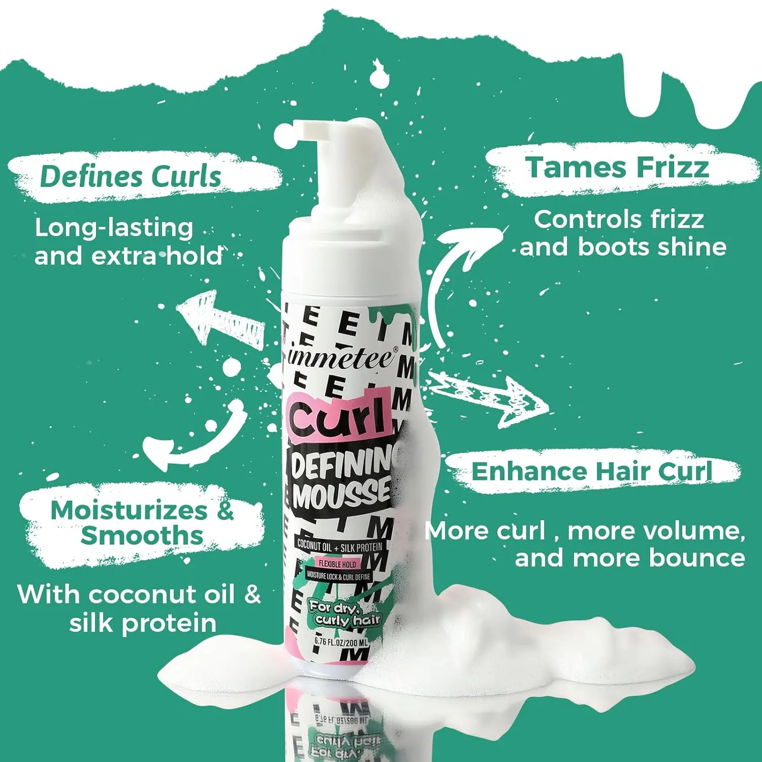 Achieve flawlessly defined and frizz-free curls with immetee Curl Control Mousse! This airy, lightweight foam is specially formulated for curly hair, providing medium hold while sealing in moisture and encouraging natural shape and separation. Say goodbye to unruly frizz and hello to bouncy, defined curls that shine with health. Our unique blend of coconut oil, silk protein, and shea butter nourishes and protects your hair, leaving it smooth, silky, and full of life. This volumizing mousse adds body and definition without the unwanted crunch or flaky residue. It also provides thermal protection, shielding your delicate curls from heat damage during styling. Whether you’re air-drying or using heat tools, immetee Curl Control Mousse helps you create stunning, long-lasting styles with ease. Experience the difference of a mousse that not only defines but also cares for your curls, leaving them looking and feeling their best. Simply pump into hands, apply to damp or dry hair, and style as desired for effortless, gorgeous curls.