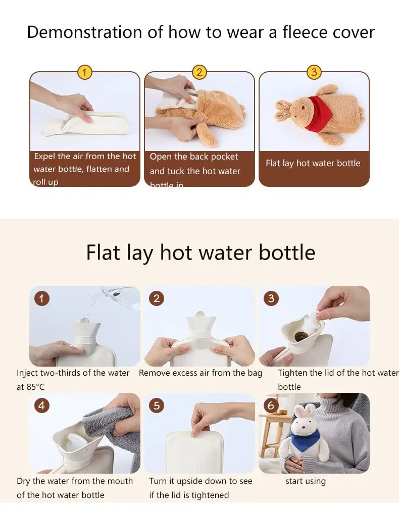 Embrace cozy warmth this winter with our adorable Cute Hot Water Bottle featuring a luxuriously soft plush cover! This isn’t just a hot water bottle; it’s a hug in a mug, perfect for chasing away the chills and soothing aches and pains. The delightful plush white rabbit design adds a touch of whimsy and charm, making it a beautiful and functional addition to your cold-weather essentials. More than just a pretty face, this hot water bottle is crafted from durable, elastic rubber that’s leak-proof and pressure-resistant, ensuring safe and long-lasting use. The innovative design provides even heat dissipation, keeping you comfortably warm for extended periods. The plush cover acts as a soft, skin-friendly barrier, preventing burns and enhancing heat retention, so you can snuggle up and enjoy the soothing warmth even longer. Beyond its winter-warming capabilities, this versatile hot water bottle can be used as a cold compress to alleviate muscle soreness, ease menstrual cramps, and reduce swelling from sports injuries. Simply fill it with cold water and apply to the affected area for refreshing relief. The cute and cuddly design also makes it a thoughtful and practical gift for loved ones on any occasion. Give the gift of warmth, comfort, and a touch of sweetness with this delightful hot water bottle. Perfect for her or for him, this hot water bottle is a cherished present for Christmas, birthdays, or any special event. Experience the soothing relief and comforting warmth of this must-have winter accessory. It’s more than just a hot water bottle; it’s a little piece of happiness for chilly days.