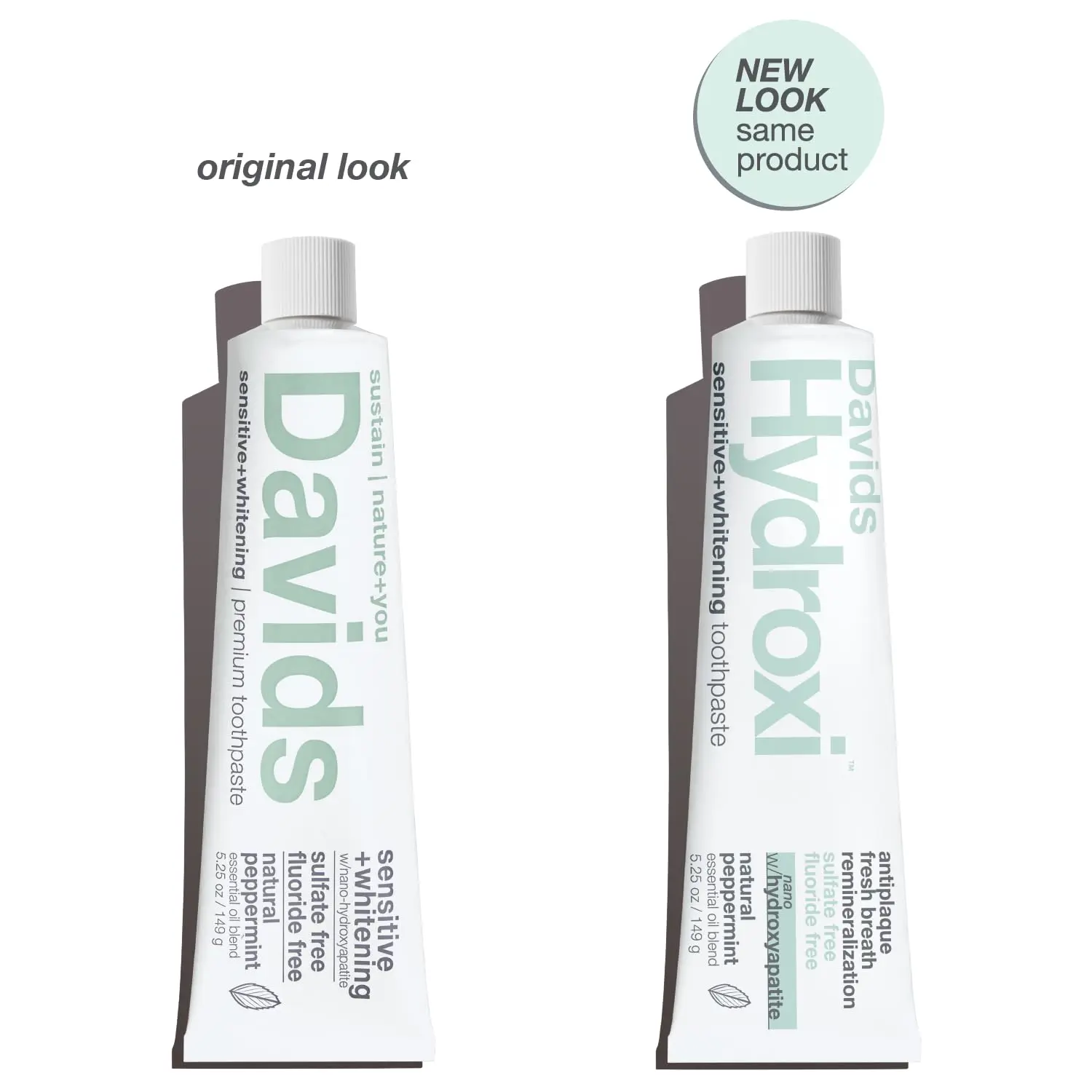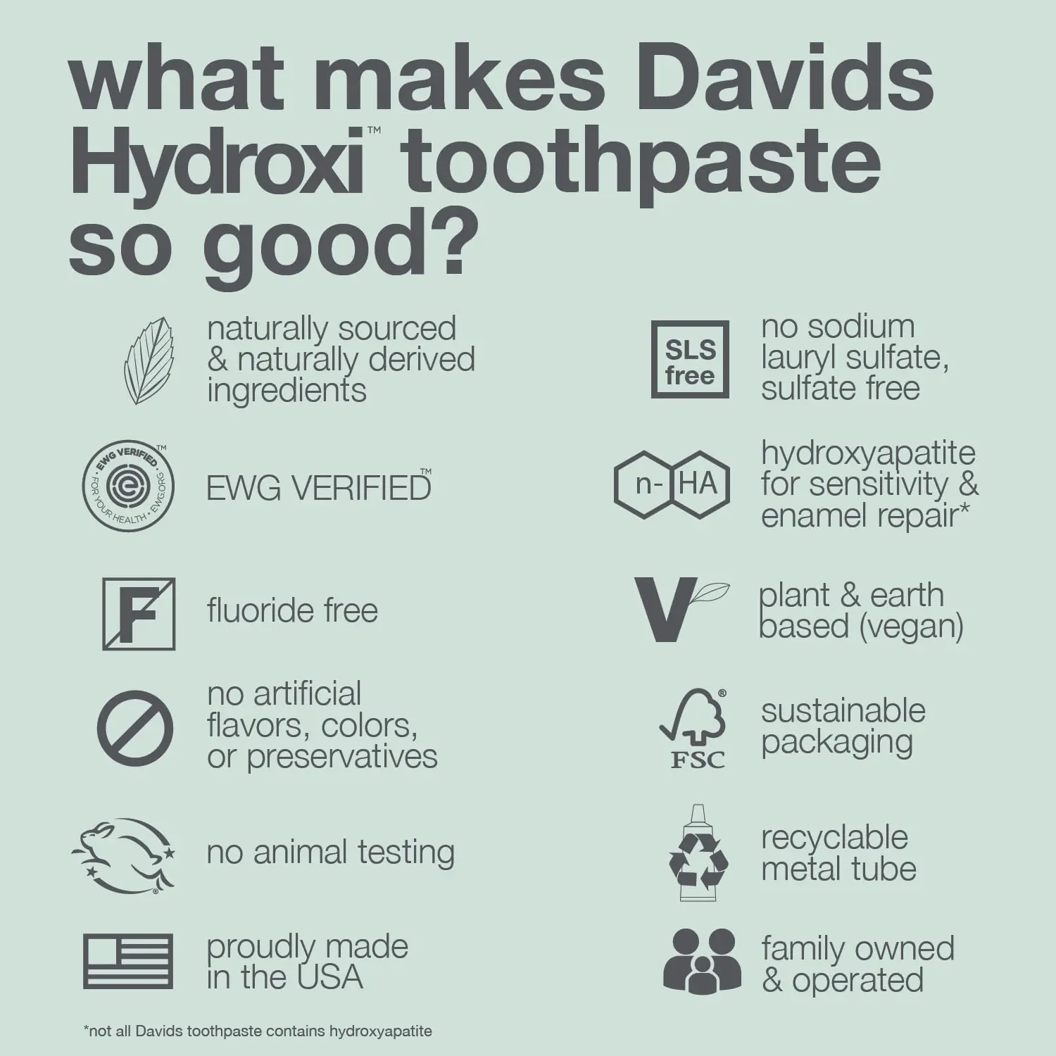 Davids Toothpaste: The natural revolution in oral care. Experience the power of Nano Hydroxyapatite (n-HA), a biocompatible ingredient that makes up 97% of your natural tooth structure. We’ve replaced fluoride with n-HA to remineralize enamel, reduce sensitivity, and naturally whiten your teeth. Our safe and gentle whitening formula uses micro-polishing agents to remove surface stains without the harshness of peroxide or bleach. Enjoy a brighter smile without the sensitivity. With an RDA of 101, Davids effectively removes plaque and surface stains while remaining gentle on your enamel for daily use. Unlike sensitive toothpastes relying on nerve-numbing drugs like Potassium Nitrate, Davids utilizes the bioactive power of Hydroxyapatite to remineralize enamel and block passageways to the nerves, providing lasting relief. Our formula is crafted with premium plant and earth-derived ingredients, ensuring a vegan, fluoride-free, and sulfate-free experience. We are EWG VERIFIED, meaning you can trust our commitment to clean and safe ingredients. No artificial flavors, colors, or preservatives are added. The inclusion of birch xylitol enhances your oral health. Davids is designed to restore a healthy pH balance and support your mouth’s natural oral microbiome. Fight plaque aggressively, reduce existing buildup, and enjoy a minty-fresh, exceptionally clean feeling. Choose Davids for a healthy mouth and a healthier you. Make the switch to a toothpaste that prioritizes your health and the environment.