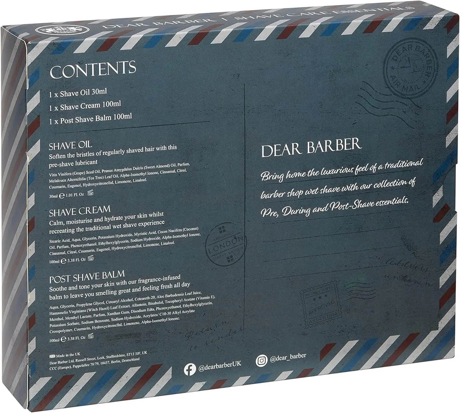Experience the art of traditional wet shaving with the Dear Barber Shave Kit, your complete three-step system for an elevated grooming ritual. This kit allows you to recreate the classic barber shop shave experience in the comfort of your own home. Start with our Pre-Shave Oil, expertly crafted to soften and prepare facial hair. It gently lubricates and conditions the skin, effectively softening coarse hair and reducing irritation for a significantly smoother razor glide. Follow with our rich and creamy Shave Cream. This luxurious formula produces a dense lather that not only calms but also moisturizes and hydrates your skin, ensuring a close and comfortable shave every time. Complete your shave with the Post-Shave Balm. This carefully formulated balm is designed to tone and soothe the skin post-shave, leaving behind a refined and long-lasting fragrance that provides all-day freshness. The Dear Barber Shave Kit is suitable for all skin types, providing a premium shaving experience for everyone. Elevate your daily routine with this essential grooming set and enjoy the timeless tradition of a classic wet shave.