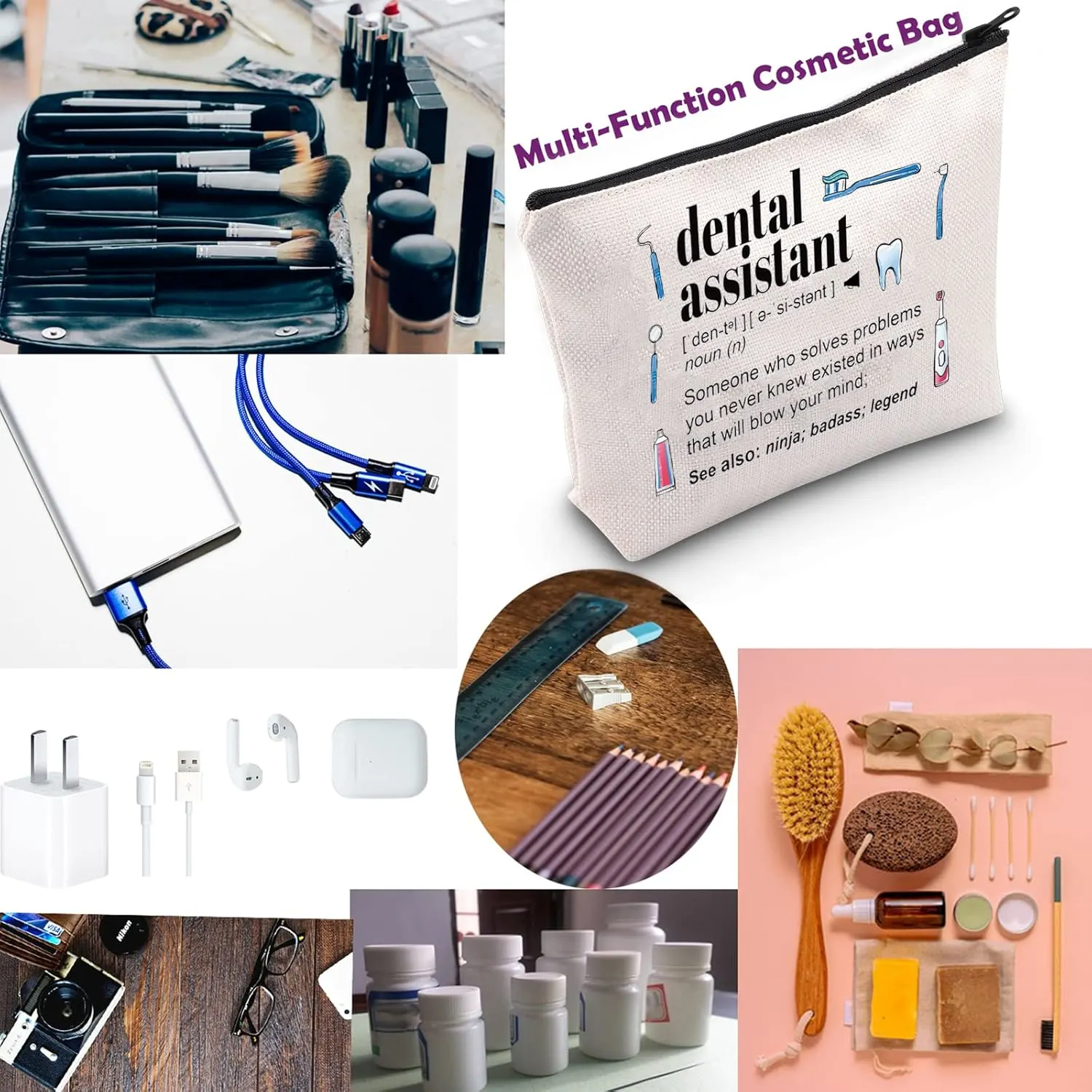 • Cute cosmetic bag printed with a fun dental assistant quote