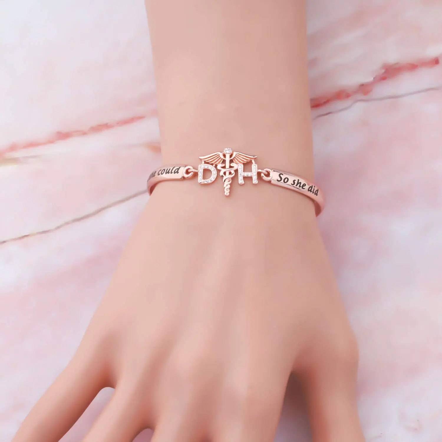 Show your appreciation for the amazing dental hygienist in your life with this elegant and inspiring “She Could So She Did” engraved cuff bracelet. Crafted from high-quality, lead-free, and nickel-free brass, this hypoallergenic bracelet is gentle on sensitive skin and designed for lasting wear. Available in stunning silver and romantic rose gold, it offers a touch of sophistication to any outfit. The bracelet’s flexible design allows for easy rotation when putting it on, ensuring a comfortable and secure fit without the worry of breakage.