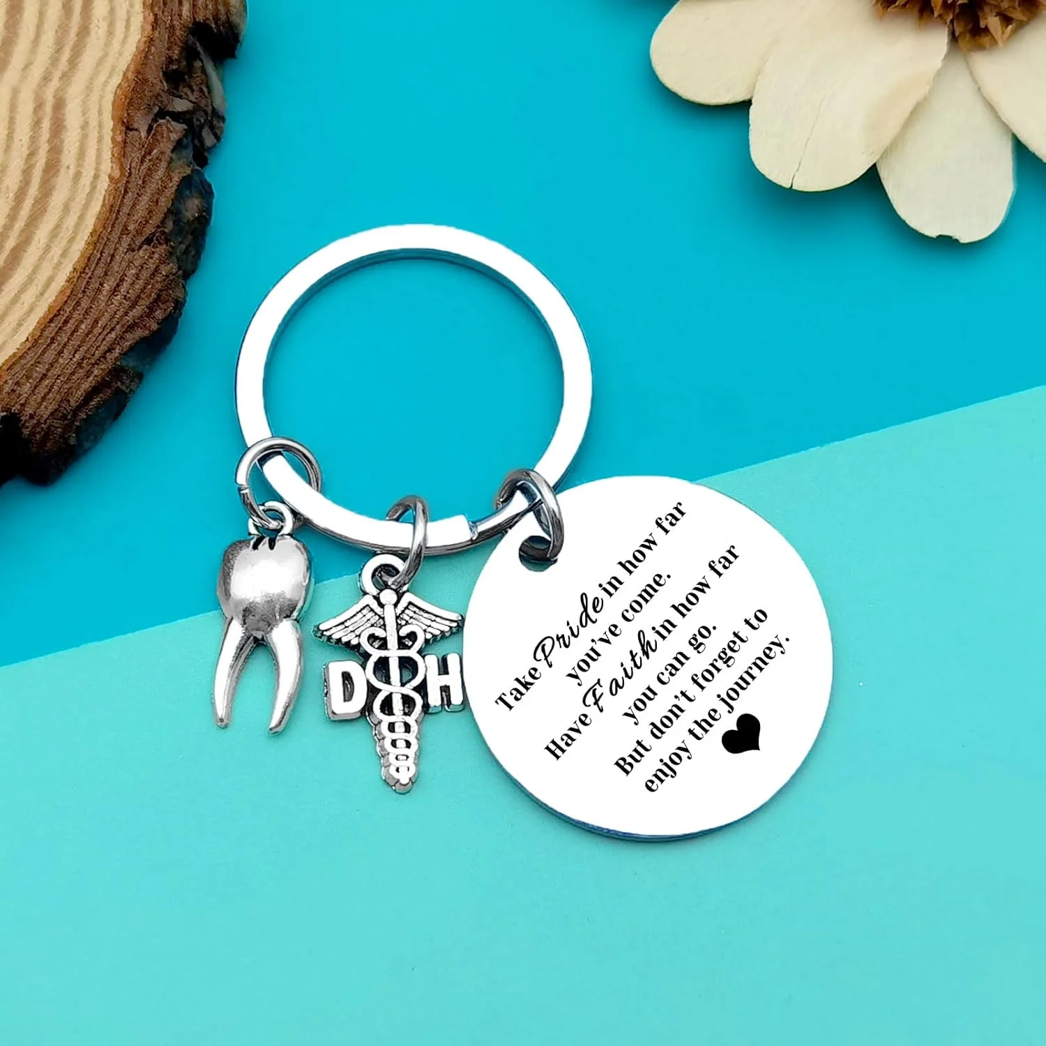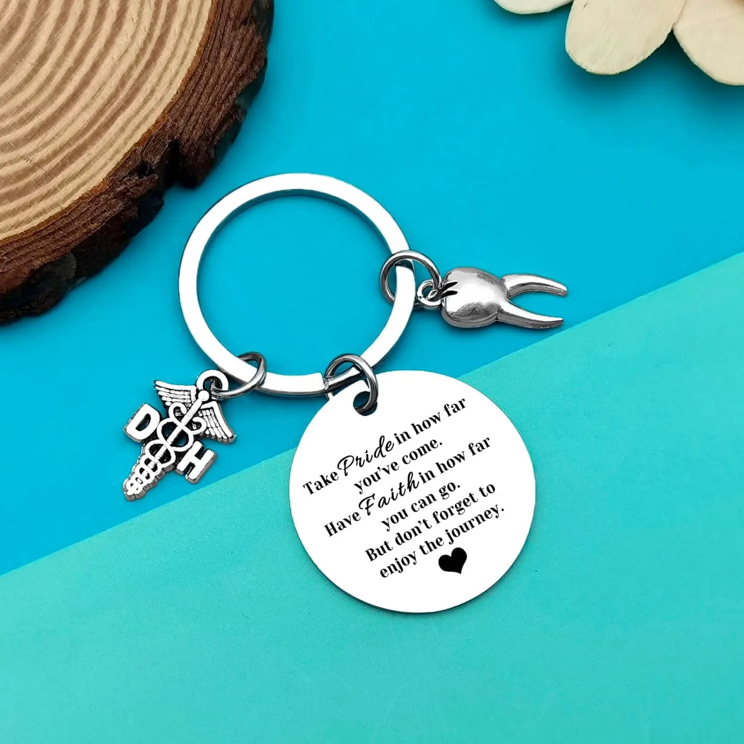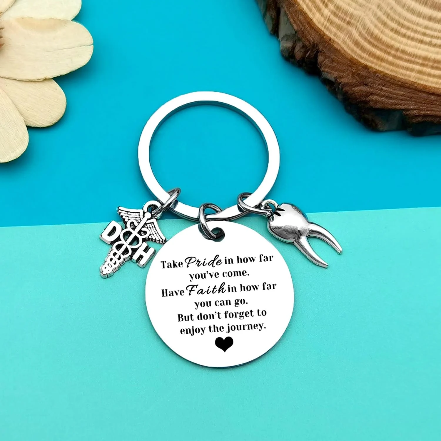 Looking for the perfect inspirational gift for a dental hygienist, dentist, or dental student? This beautifully crafted keychain is an ideal choice! Featuring the uplifting message: “Take pride in how far you’ve come. Have faith in how far you can go. But don’t forget to enjoy the journey”, it serves as a constant reminder of their dedication and hard work. This makes it a thoughtful present for dental school students embarking on their career, experienced professionals in dental practices, or anyone passionate about oral healthcare. Whether it’s a dentist graduation gift, a token of appreciation for a dental assistant, or a special present for an orthodontist, this keychain is sure to be cherished. Suitable for future dental hygienists, dental professors, dental graduates, and all dental office staff. It’s a versatile gift option perfect for graduations, birthdays, anniversaries, Christmas, Thanksgiving, Valentine’s Day, New Year celebrations, or simply to show your appreciation. Made from durable stainless steel, this keychain is designed to last, symbolizing the enduring value of their profession. Each keychain comes with a free velvet pouch, making it ready for gifting and ensuring a memorable presentation. Give the gift of encouragement and inspiration with this timeless dental profession keepsake. This is more than just a keychain; it’s a daily reminder of their value and impact on the lives of others, celebrating their commitment to oral health. It is hypoallergenic and will not tarnish. A Perfect graduation and birthday gift for Dental Hygienist, dentist, dental assistant, dental technician for birthday or just because.
