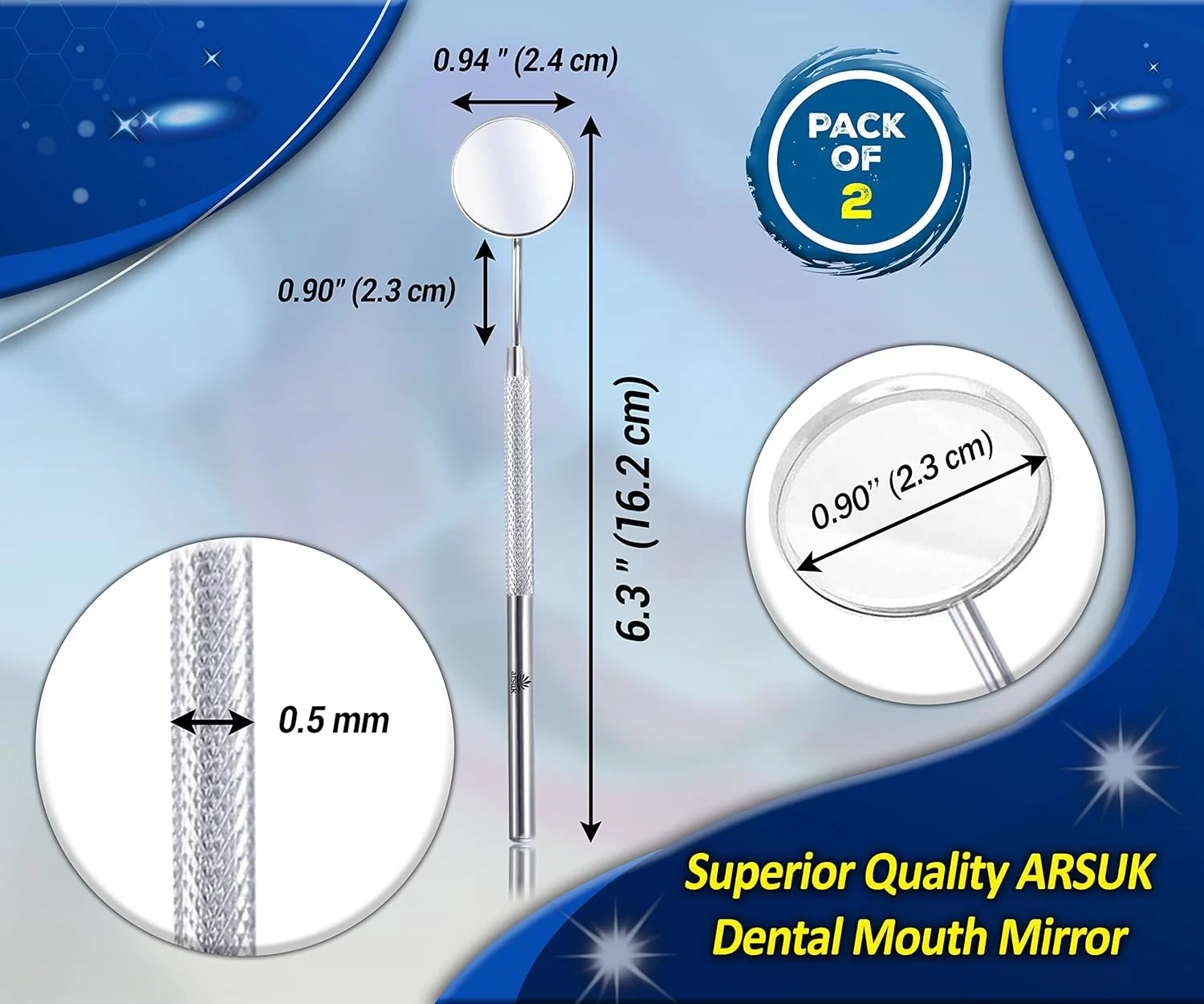 Achieve a brighter, healthier smile with our premium Dental Mirror Anti-Fog Oral Mirror. This essential teeth inspection tool provides a clear and comfortable way to examine hard-to-reach areas in your mouth. The anti-fog mirror surface ensures a consistently clear view, allowing for easy inspection of teeth, gums, and overall oral health. The ergonomic, high-quality handle offers a comfortable and secure grip, making it easy to maneuver and achieve accurate viewing. This dental mirror is a practical oral care tool for maintaining optimal oral hygiene and detecting potential issues early. Its design facilitates explicit viewing of back, forth, under, inside, and outside areas of the mouth that are typically difficult to see. Team up with our Top Selling ARSUK Double Headed Tarter Remover to maintain Tarter build-up