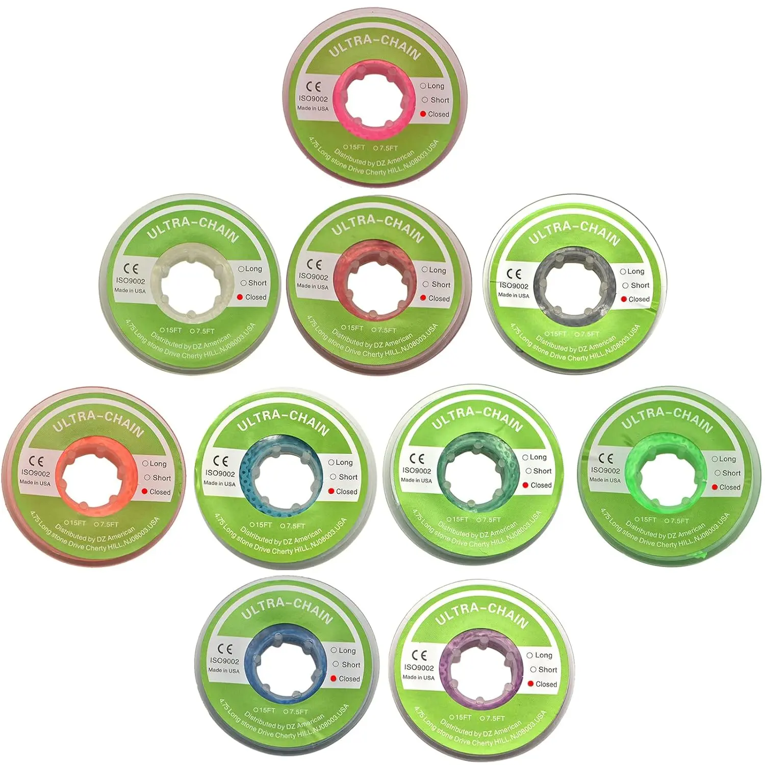 Not only are they functional, but they also add a touch of fun to your braces! Available in 10 bright and lovely colors, including white, grey, purple, light green, green, blue, dark blue, red, pink, and orange, these power chains are sure to be eye-catching.