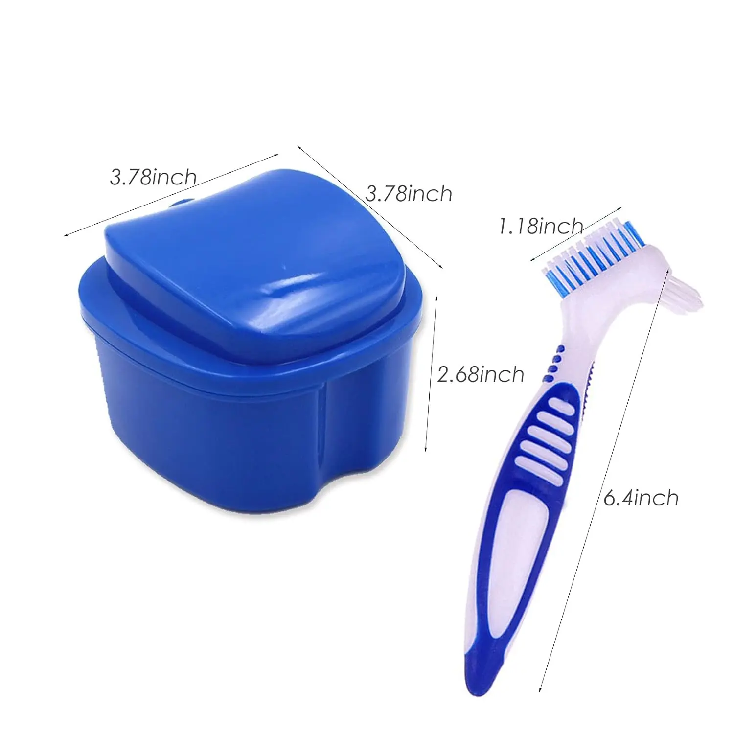 Keep your dentures clean, safe, and conveniently stored with our comprehensive Denture Bath Case Kit with Brush. This all-in-one solution provides everything you need for optimal denture care, ensuring a fresh and confident smile every day. The kit includes two denture bath cases in calming blue and light blue hues, along with two dual-ended denture cleaning brushes in matching blue and purple. This set provides ample replacements for daily use and ensures you always have a clean option available. The denture cleaner cases are not only perfect for storing false teeth, but they can also be used for cleaning dentures, jewelry, storing mouth guards, pacifiers, bite guards, or even organizing small items. Maximize the life of your dentures and maintain excellent oral hygiene with this convenient and practical kit.