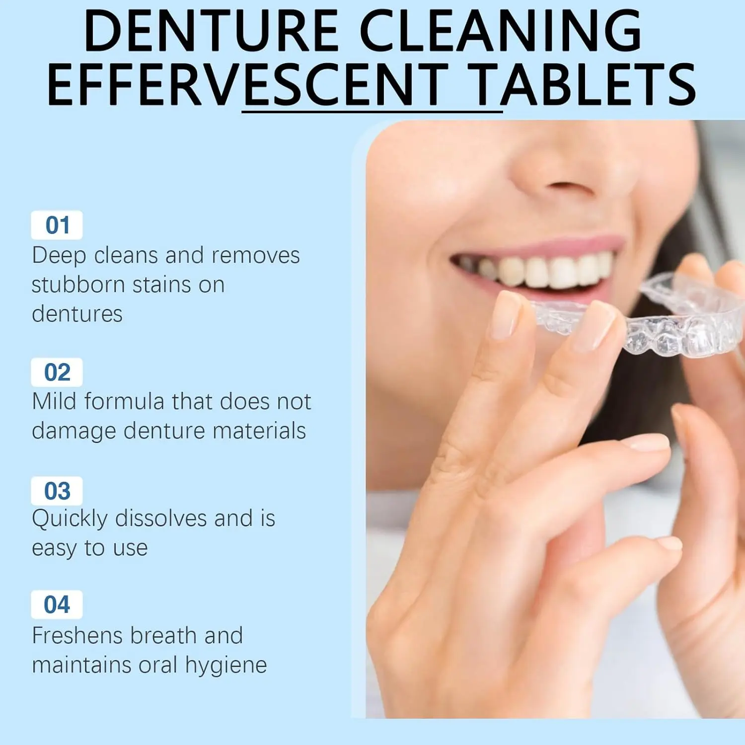 Keep your dental appliances sparkling clean and fresh with our Denture Retainer Cleaner Tablets! These powerful effervescent tablets are designed to effectively remove stubborn stains, eliminate unpleasant odors, and break down plaque buildup, ensuring your retainers, dentures, night guards, aligners, and other dental devices stay in top condition. Our specially formulated cleaner is safe for daily use and gentle enough to prevent scratches or damage. Unlike abrasive toothbrushes, these tablets provide a thorough clean without compromising the integrity of your appliances. The convenient, individually packaged tablets are perfect for both home use and travel, making it easy to maintain your oral hygiene wherever you go. Free from harsh chemicals and bleach, our safe and cruelty-free formula is gentle enough for the whole family, even baby teethers. Enjoy a fresher, cleaner mouth with the ease and convenience of our Denture Retainer Cleaner Tablets! Restore your confidence and extend the life of your dental appliances with our effective and reliable cleaning solution. Get rid of stubborn stains caused by coffee, tea, and food particles, and say goodbye to lingering odors. Choose our tablets for a brighter, healthier smile! With our gentle non-abrasive formula you can be sure that your Dental appliance will stay smooth and clean.