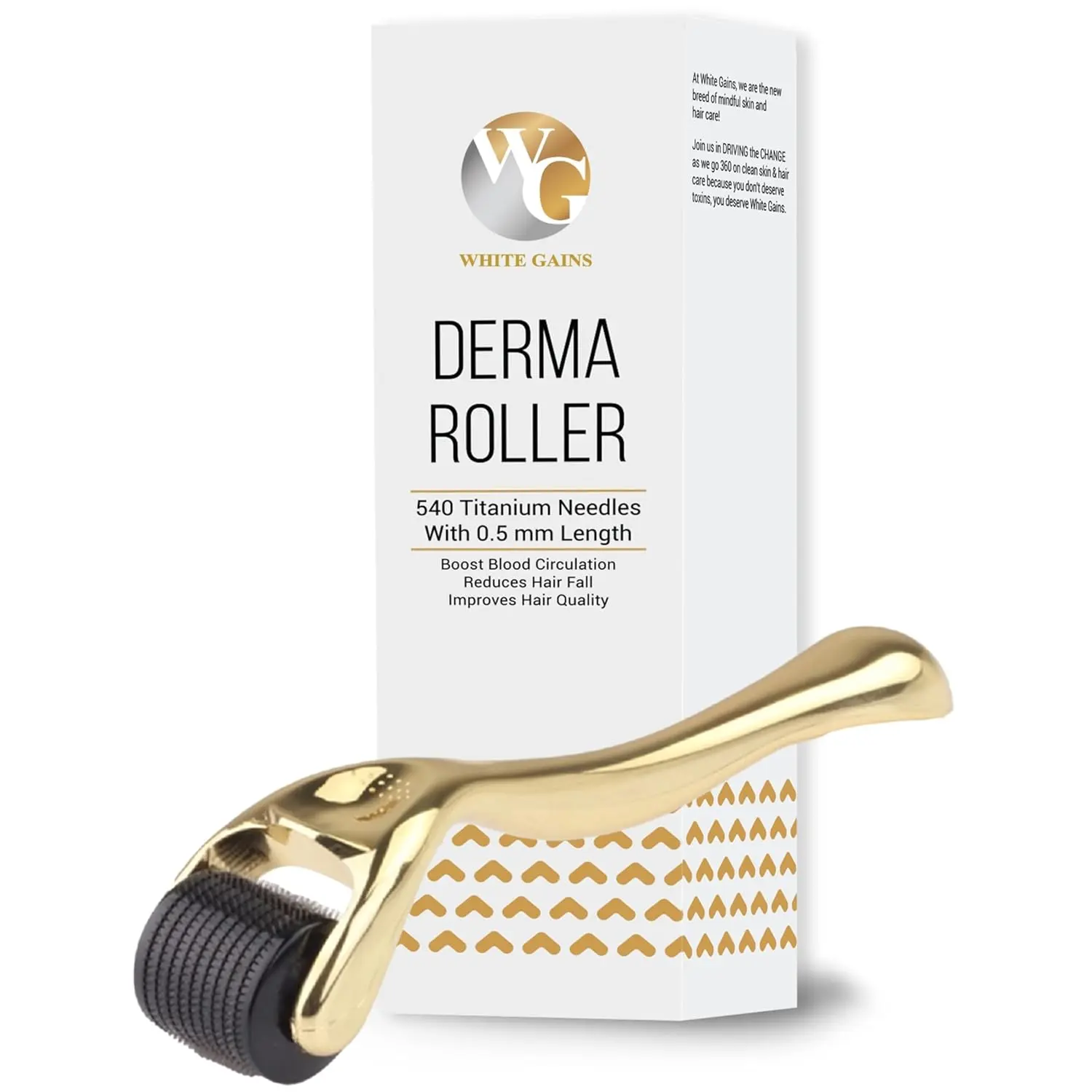 WHITE GAINS derma roller boosts hair growth by stimulating follicles and increasing serum absorption. 540 titanium needles & ergonomic design for effective at-home treatment.