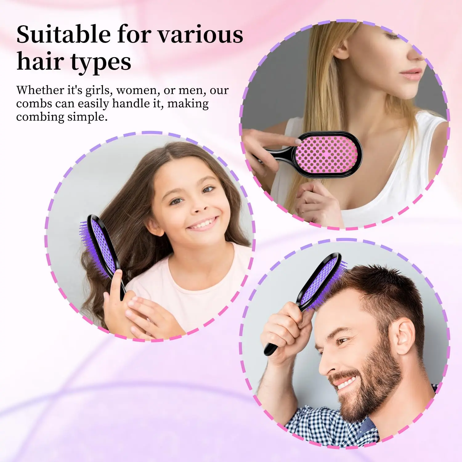 Experience effortless detangling and gentle hair care with our Detangling Brush 2 Pack. This set of high-quality brushes is designed to glide through wet or dry hair, minimizing breakage and maximizing shine. The ergonomic design ensures a comfortable grip, reducing hand fatigue during styling. The hollow design promotes optimal airflow, reducing heat damage during blow-drying and preventing static buildup for smoother, more manageable hair. This versatile brush is suitable for all hair types, including wigs, making it perfect for professional stylists and home users alike. Whether you’re smoothing wet hair after a shower, adding luster to dry hair, or styling a wig, this detangling brush is your go-to tool. Keep one at home and take the other on the go for flawless hair wherever you are. This brush will promote healthy and shiny hair and will reduce the thermal damage when drying with a hair dryer. The ergonomic handle is designed to fully consider your comfort, provide a secure grip, and reduce hand fatigue during use. Flexible and elastic bristles can gently comb wet hair without causing hair breakage, which is very suitable for use immediately after shower. On dry hair, the brush can slide smoothly, reducing the briskness and increasing the luster.
