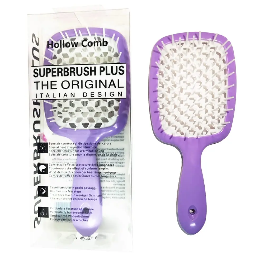 The SUNG PURPLE/WHITE Detangling Hair Brush features longer bristles for gentle detangling, a vented design for fast drying, and is easy to clean. Perfect for all hair types!