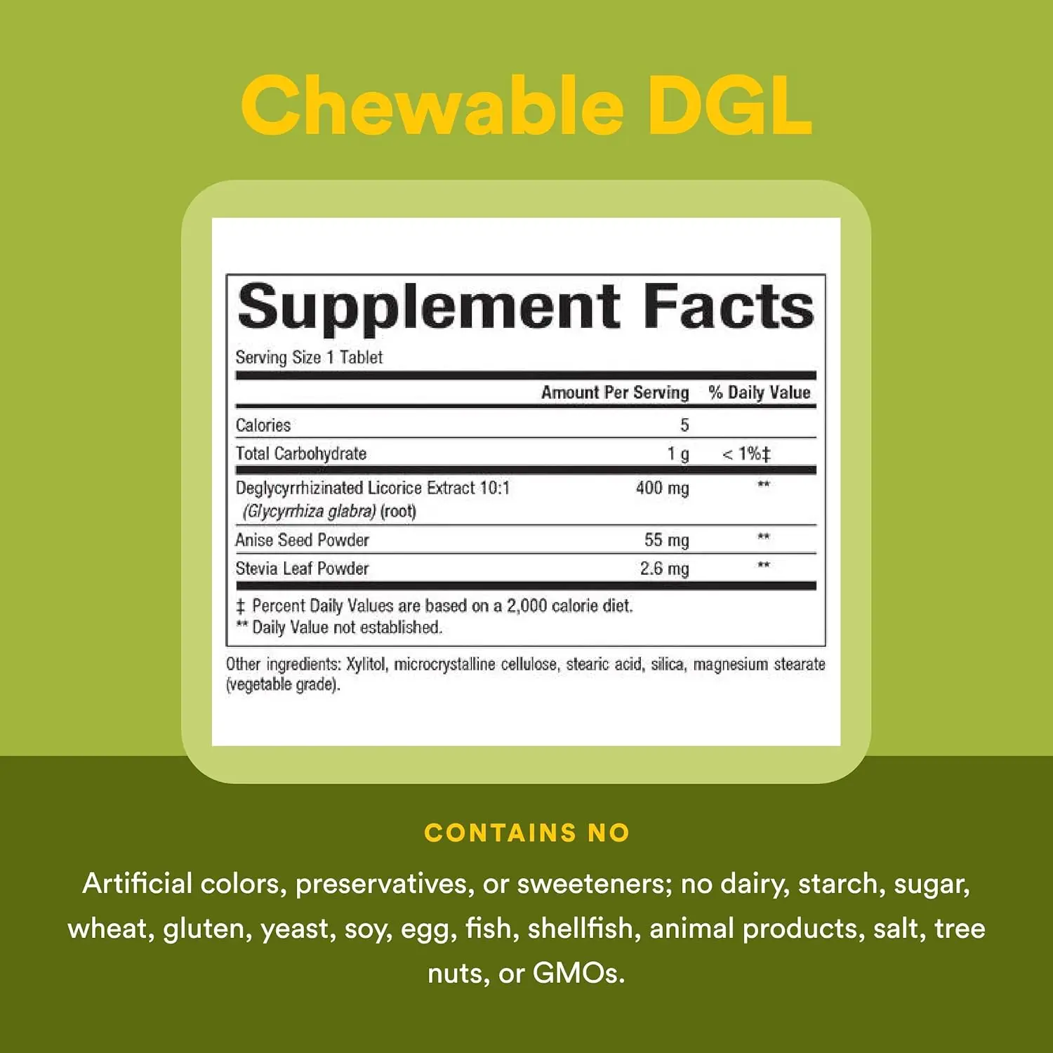 DGL chewables promote GI health, protecting stomach lining and soothing inflamed tissue. Sugar-free, Non-GMO, gluten & soy free, vegan friendly.