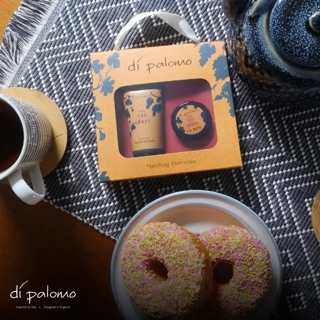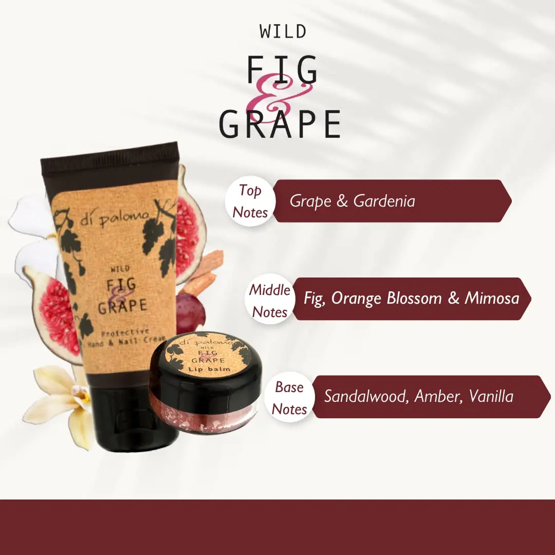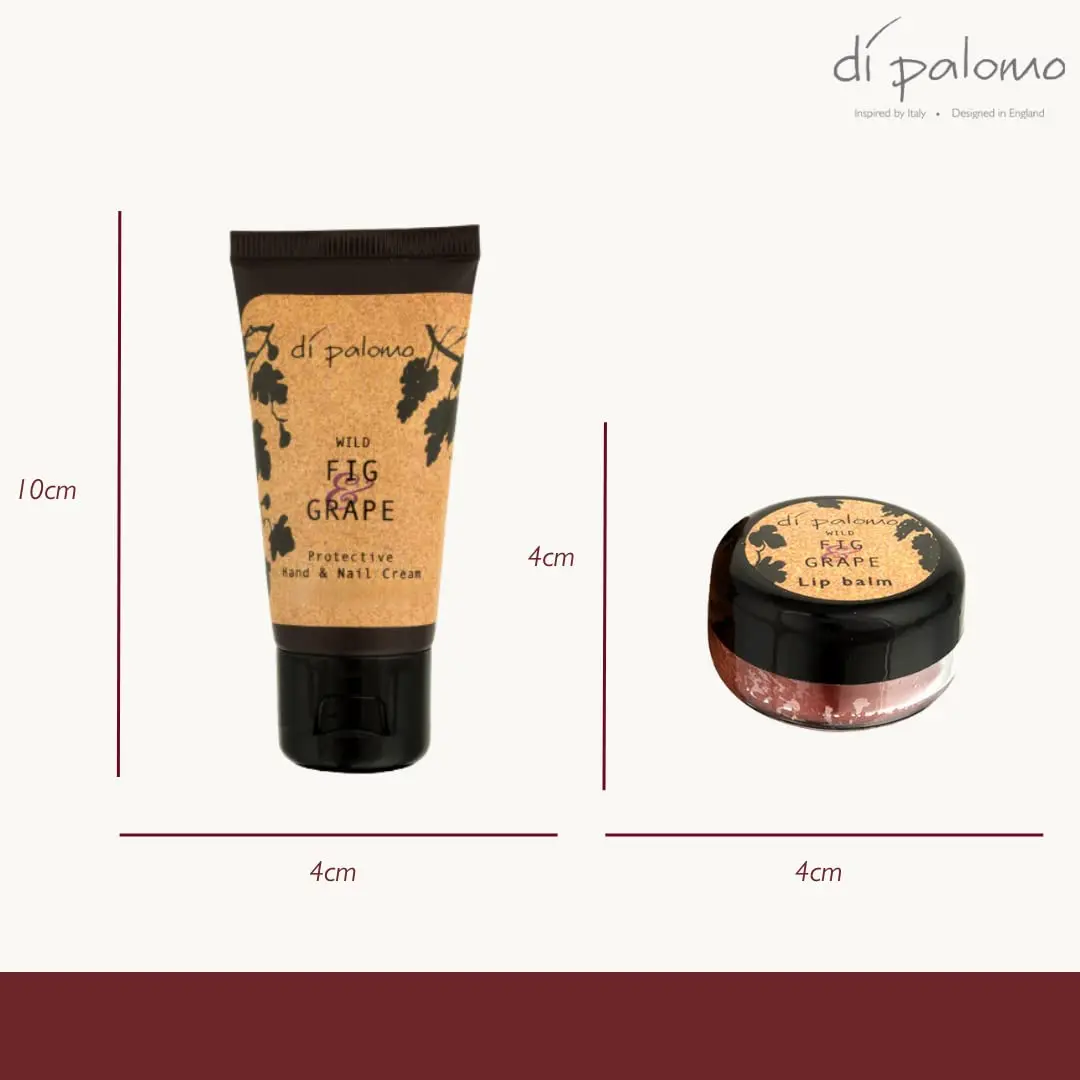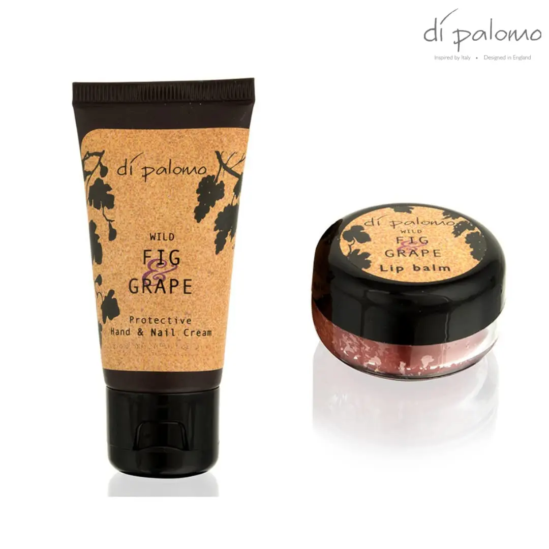 The Di Palomo Wild Fig Handbag Essential Set features a nourishing hand & nail cream and a luscious lip balm, infused with the exotic scent of wild fig & G. Cruelty free & UK made.