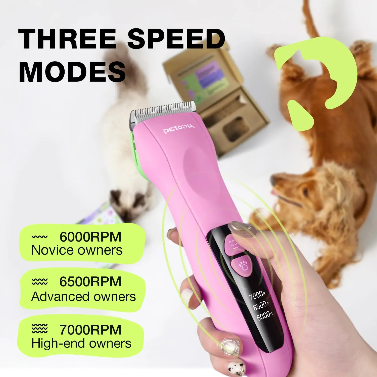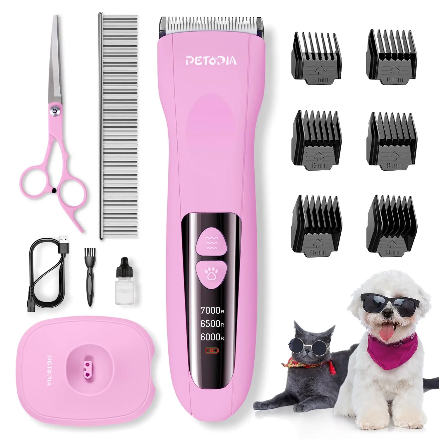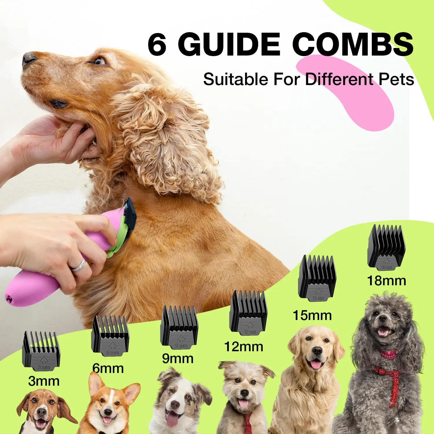 Groom your furry friend with ease and comfort using these Dog Clippers! Featuring a new user-friendly design, these clippers are perfect for both professional groomers and pet owners alike. The adjustable taper lever and six guard combs provide versatile hair lengths and styling options, allowing you to achieve the perfect look for your dog. The titanium-ceramic blade is safe and sharp, ensuring a comfortable grooming experience that’s gentle on your pet’s skin, making it ideal for even matted long hair. Say goodbye to stressful grooming sessions! These clippers boast low vibration and ultra-quiet operation, with a noise level of less than 45dB, creating a soothing environment for your pet. With three adjustable speeds and a powerful 7000RPM mode, these clippers are easy to use and suitable for different comfort levels and hair thickness. Enjoy long-lasting cordless convenience with the USB rechargeable battery, providing 4 hours of runtime. The wireless design allows for on-the-go pet grooming, wherever you may be! Keep your beloved canine looking their best with these reliable and user-friendly dog clippers.