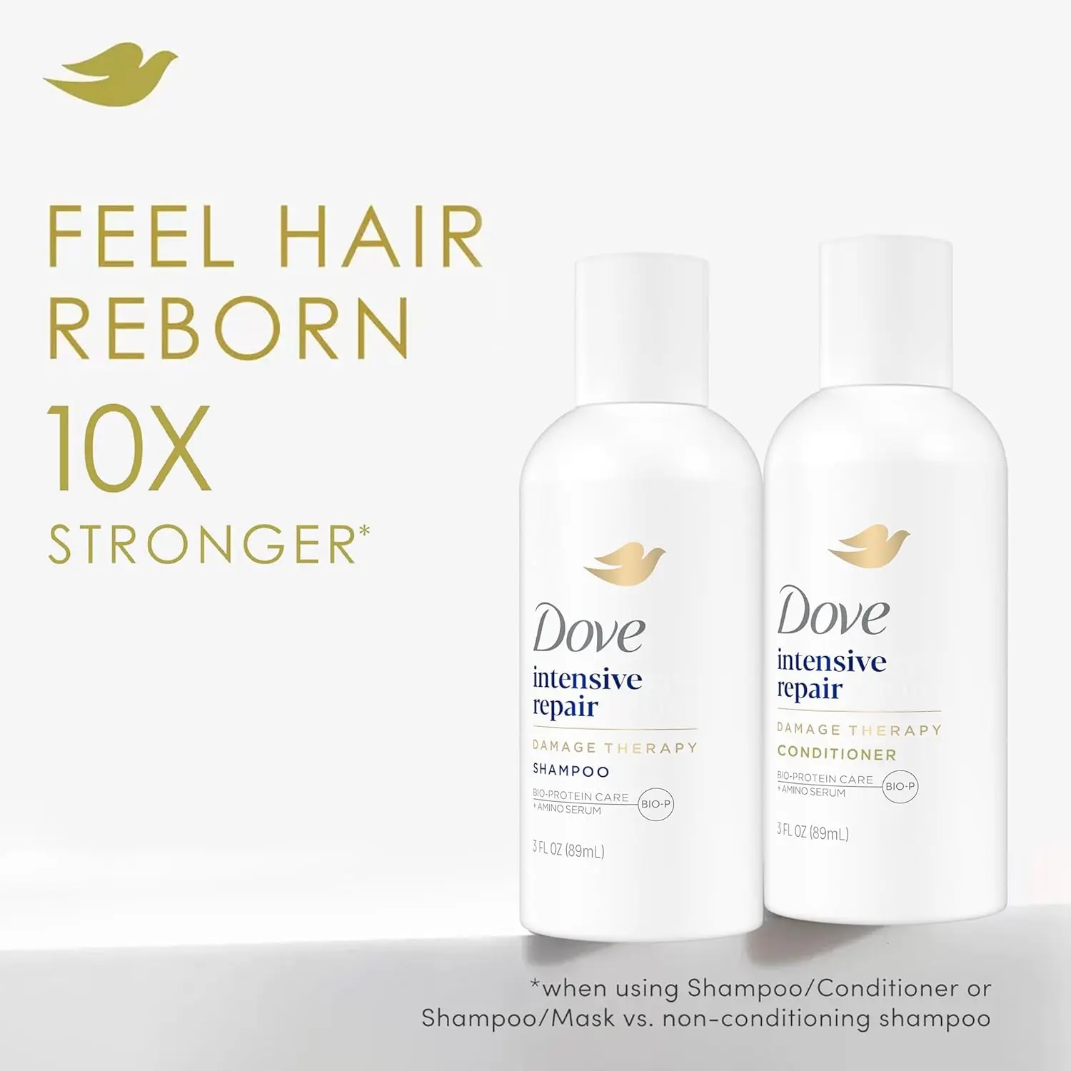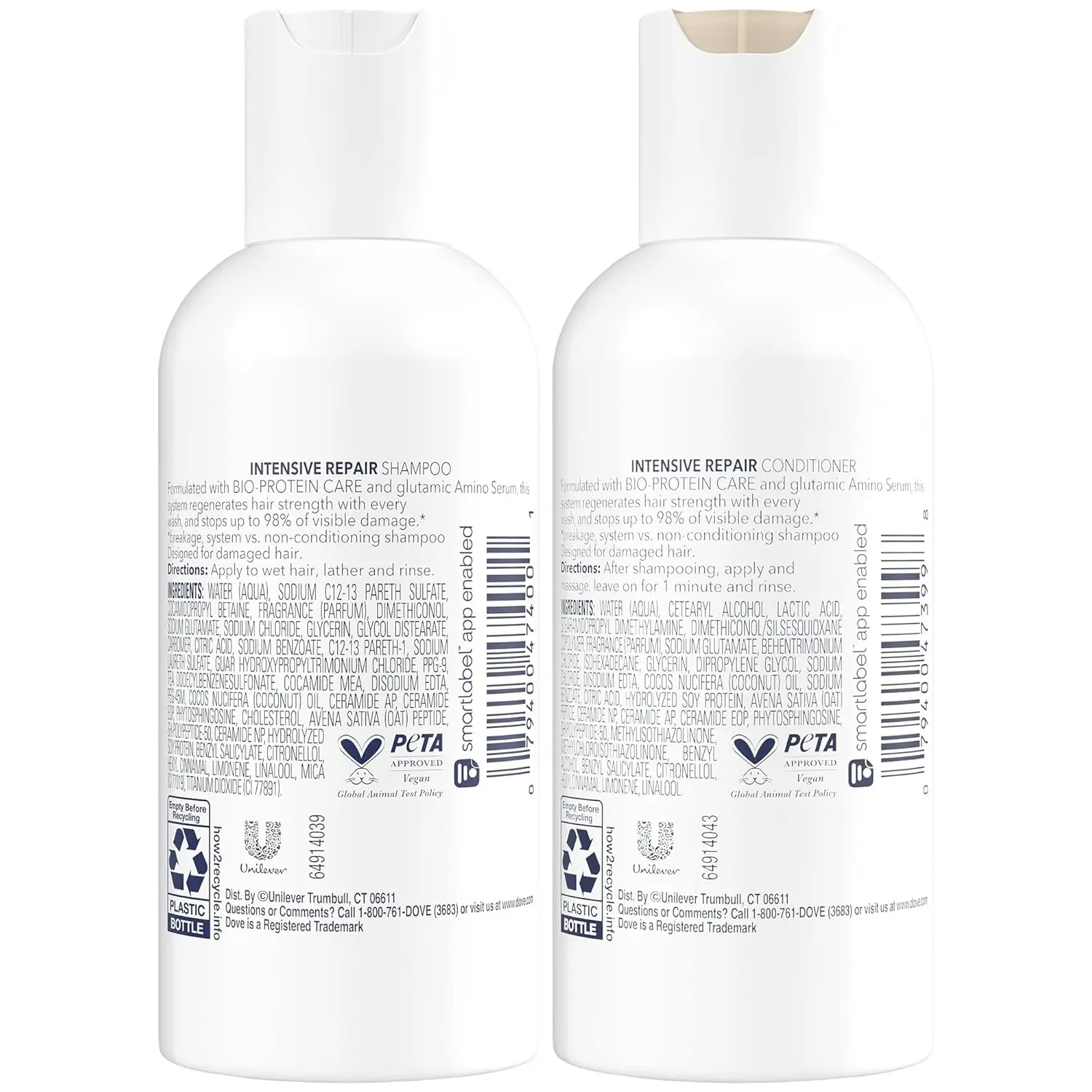 Dove Intensive Repair Shampoo and Conditioner, a powerful duo with Bio-Nourish Complex and Keratin Repair Actives, repairs damage, prevents breakage, and leaves hair soft and shiny.