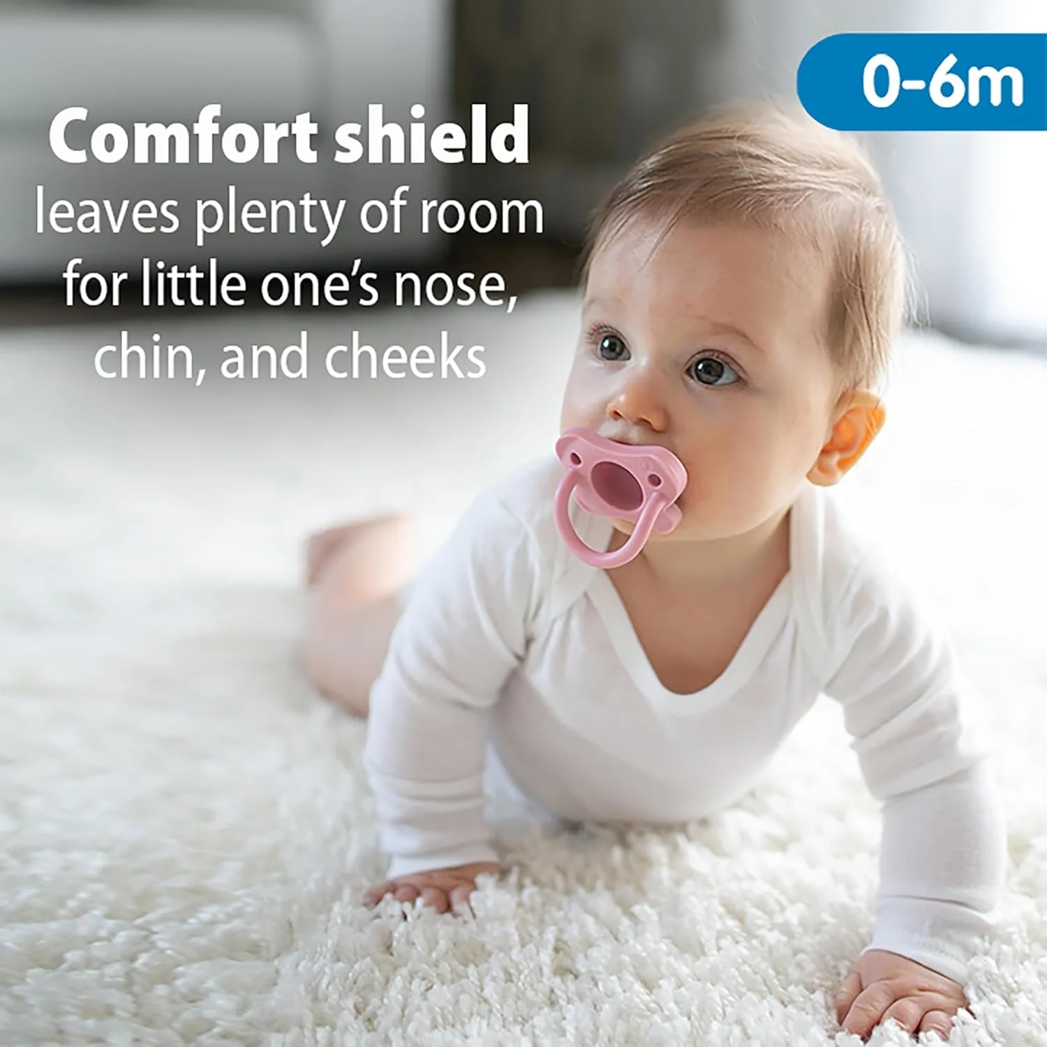 The contoured butterfly-shaped shield is designed for maximum comfort, curving away from your baby’s face to provide ample room for their nose, chin, and cheeks. The breathable design features holes in the shield that allow for airflow, reducing the chance of irritation on delicate skin. The open back design allows parents to place a finger into the pacifier, fostering bonding and helping to soothe a fussy baby.