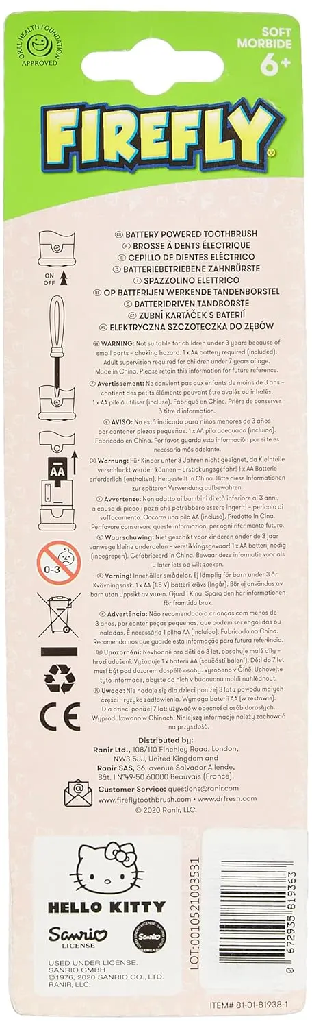 Make brushing fun with the Dr. Fresh Hello Kitty Battery Toothbrush in Pink! This adorable toothbrush is designed to encourage kids to develop healthy oral hygiene habits from a young age. The vibrant pink color and beloved Hello Kitty character will make brushing time something they look forward to. The battery-powered action provides gentle yet effective cleaning, removing plaque and promoting healthy gums. Its small, soft bristles are gentle on delicate gums and teeth, ensuring a comfortable brushing experience. The ergonomic handle is perfectly sized for little hands, making it easy for children to grip and control. This toothbrush is a great way to instill good habits that will last a lifetime. Watch your little one smile with confidence! Perfect for toddlers and young children who are learning to brush independently. Say goodbye to brushing struggles and hello to a sparkling clean smile with Hello Kitty! Give your child the gift of healthy teeth and gums with this engaging and effective toothbrush. Its engaging design can transform a chore into a joy, ensuring consistent and thorough cleaning. It’s a parent-approved way to make oral hygiene enjoyable for kids. Designed with child safety in mind, this toothbrush is durable and reliable. Invest in your child’s dental health with this fun and functional toothbrush. The rotating head provides effective cleaning action that helps remove plaque and keep teeth healthy. The cute Hello Kitty design makes brushing enjoyable and encouraging.