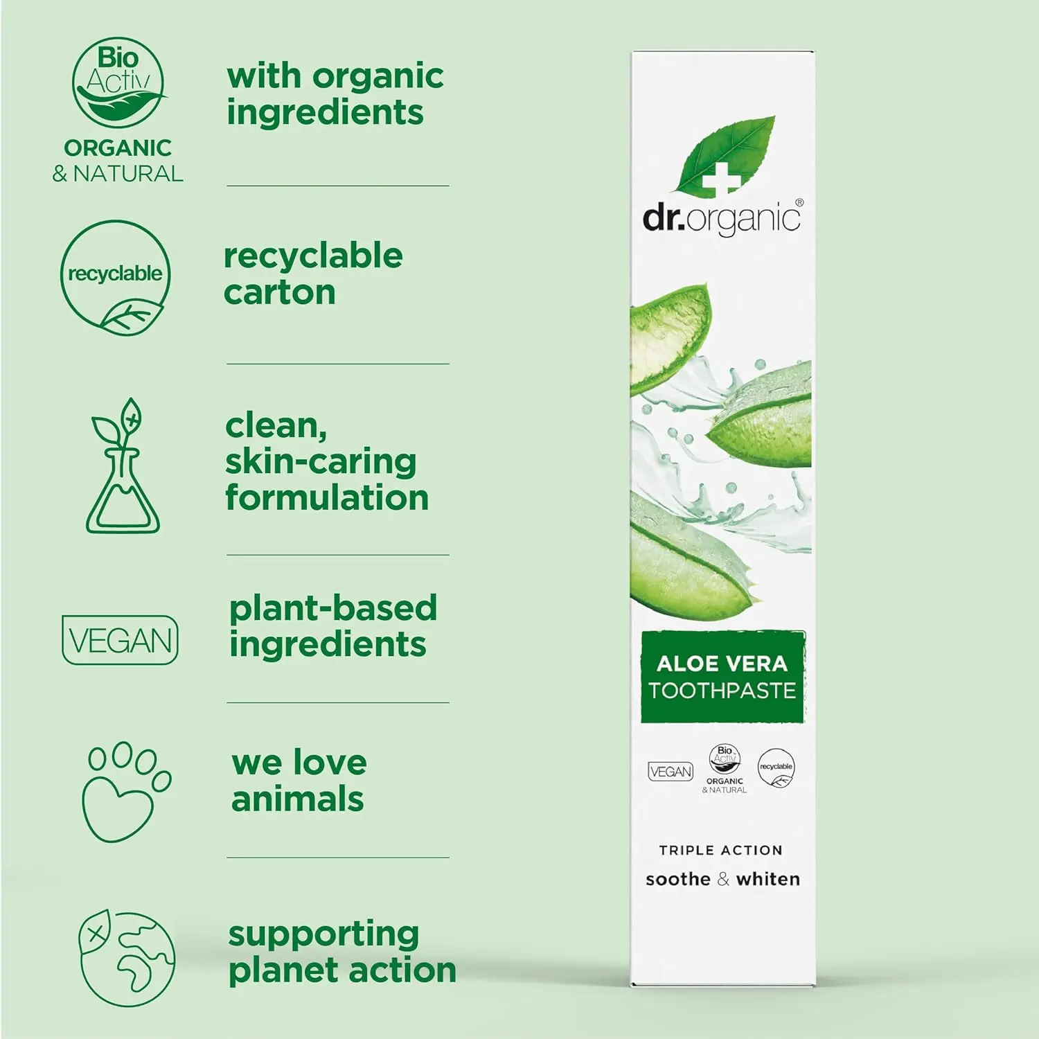 Discover the natural power of Dr. Organic Aloe Vera Toothpaste! This gentle yet effective toothpaste, formulated with organic aloe vera, provides a refreshing and soothing clean. Perfect for sensitive teeth and gums, it helps maintain healthy teeth and fresh breath. Our unique formula combines the soothing properties of aloe vera with a blend of natural ingredients to help protect against plaque, tartar buildup, and cavities. Experience the difference of a toothpaste that cares for your oral health while being kind to your body and the environment. Free from harsh chemicals and artificial sweeteners, Dr. Organic Aloe Vera Toothpaste offers a natural alternative for a brighter, healthier smile. Its mild minty flavor leaves your mouth feeling clean and refreshed without any harsh aftertaste. This 100ml tube is perfect for everyday use and travel, ensuring your oral hygiene routine is always on point. Embrace the natural benefits of aloe vera and enjoy a confident, healthy smile with Dr. Organic! This toothpaste is also great for those looking to avoid fluoride and other artificial additives. Promote healthy gums and strong teeth with this carefully crafted formula, designed to provide gentle yet effective cleaning. Make the switch to Dr. Organic Aloe Vera Toothpaste and experience the difference today! It’s a natural way to care for your smile.