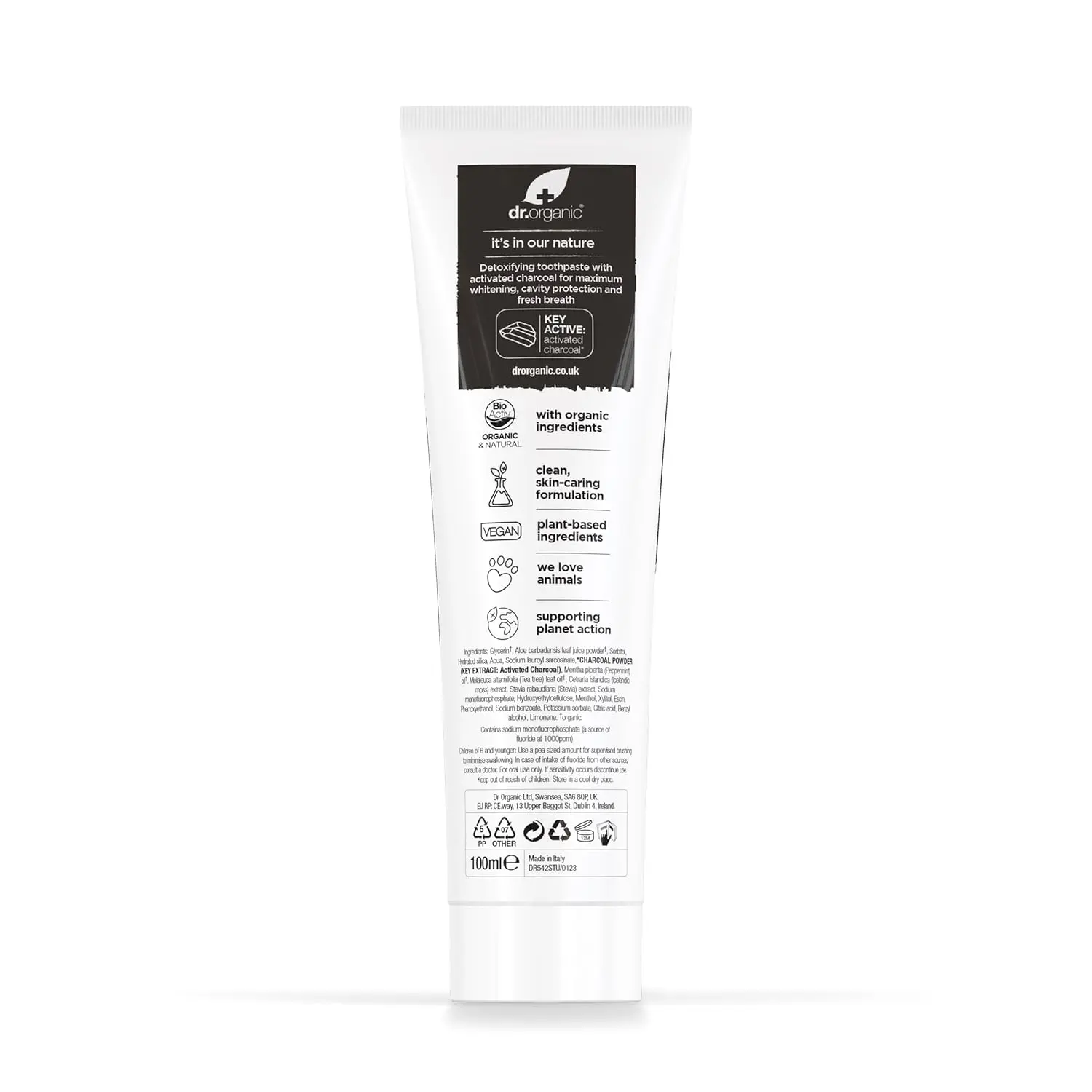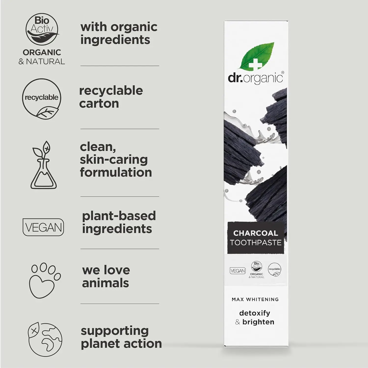 Experience the power of nature with Dr. Organic Charcoal Toothpaste. This expertly formulated toothpaste harnesses the potent benefits of bioactive, natural, and organic ingredients to deliver a comprehensive oral care solution. Our unique blend includes silica for gentle yet effective cleaning, Icelandic moss known for its soothing properties, and invigorating peppermint oil for a refreshing burst of flavor. This toothpaste is designed to naturally whiten your teeth, fight cavities, and soothe your gums. The tingling fresh sensation revitalizes your mouth, leaving you feeling clean and confident. Dr. Organic Charcoal Toothpaste is organically certified, ensuring you are using a product that is both effective and environmentally conscious. Say goodbye to harsh chemicals and hello to a brighter, healthier smile with the natural power of Dr. Organic. Protect your teeth and gums with this naturally formulated toothpaste. Embrace a brighter, healthier smile with every brush. Experience the difference of organically certified ingredients and a refreshing, tingling sensation that leaves your mouth feeling clean, revitalized, and naturally white.