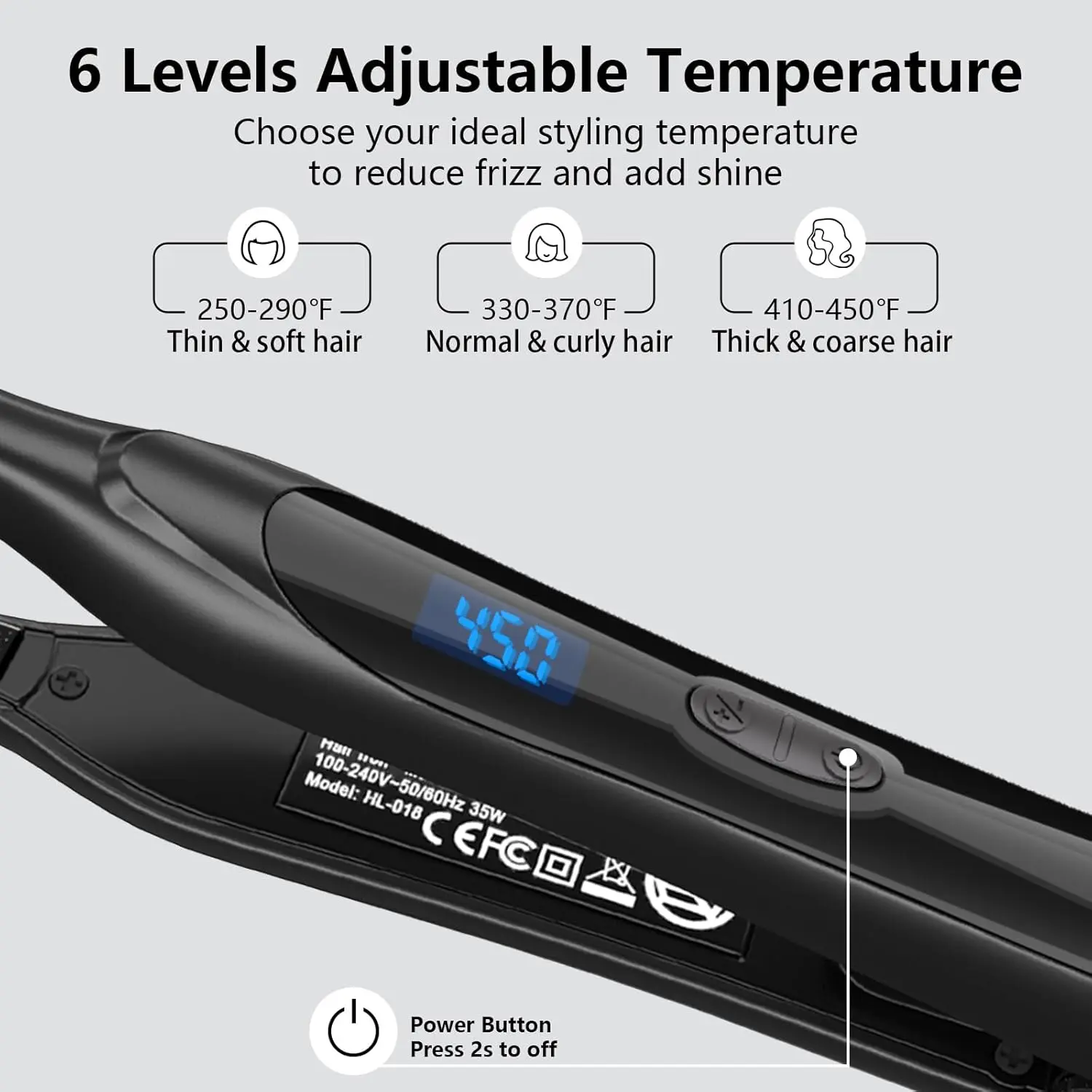 • 6 adjustable temperature settings (140-450℉) for all hair types.