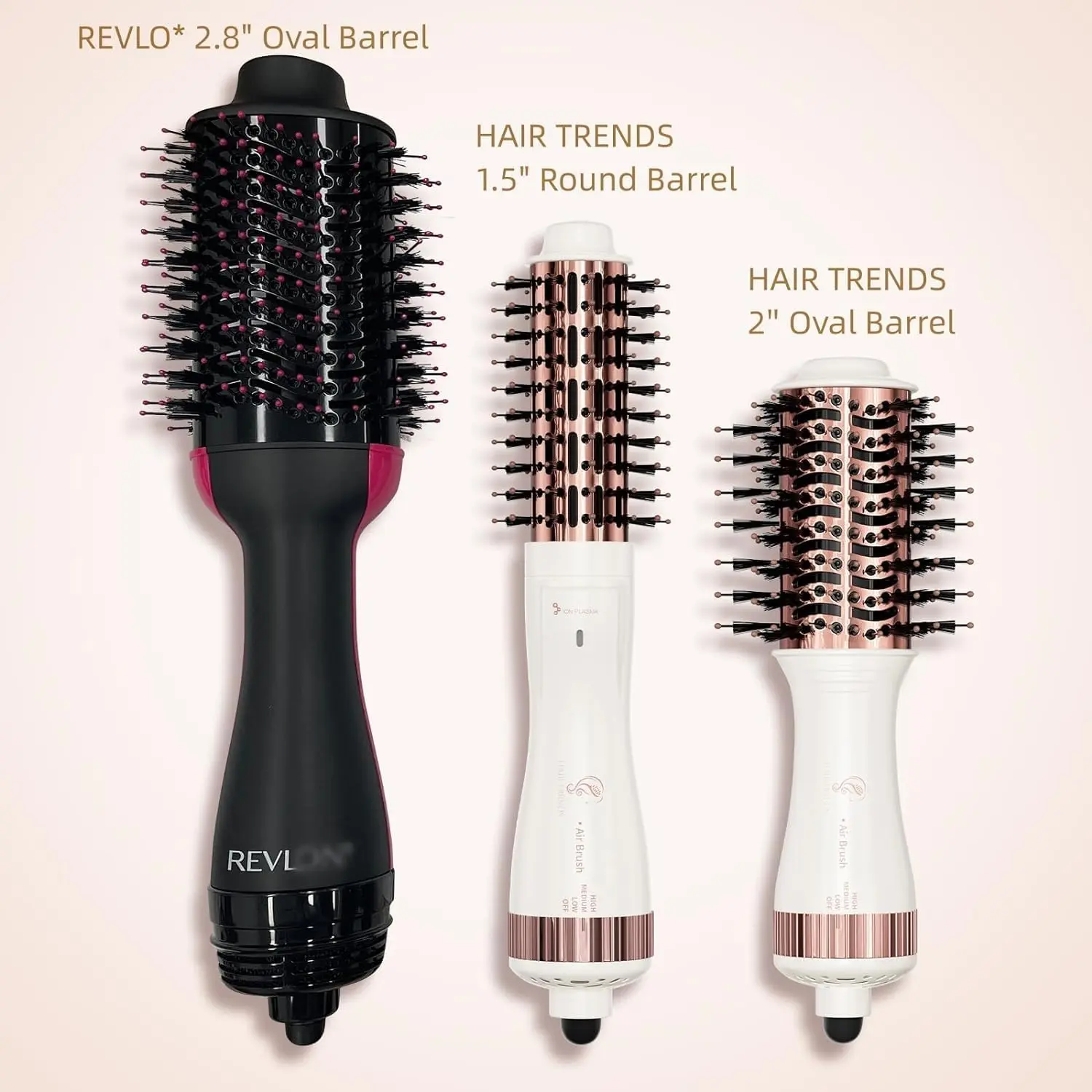 The HAIR TRENDS 2-inch oval brush blow dryer combines the functions of a hairdryer, curler, straightener, and brush into one convenient tool. The non-detachable nano titanium barrel with tangle-free combination bristles ensures efficient heat transfer for long-lasting hairstyles, adding lift at the root, smooth body, and curled ends.