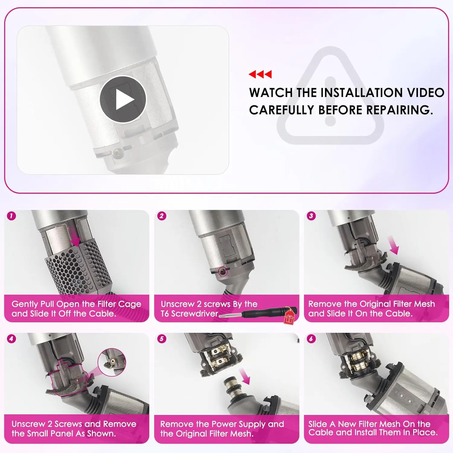 Keep your Dyson Airwrap hair styler performing at its best with this high-quality inner filter replacement. Specifically designed for Dyson Airwrap models HS01 and HS05, this replacement filter ensures optimal airflow and protects the motor from hair, dust, and debris. Replacing a worn or damaged filter is crucial for maintaining the longevity and efficiency of your Airwrap. A damaged filter can allow particles to enter the motor, potentially leading to overheating, reduced performance, and even irreparable damage. Our replacement filter is crafted from durable, premium materials, ensuring a perfect fit and reliable performance. The included T6 screwdriver makes installation quick and easy, following readily available video instructions. Don’t compromise the performance of your Dyson Airwrap. Invest in this essential replacement filter to keep your styler running smoothly and efficiently, providing you with flawless styling results every time. This filter helps prevent breakdowns and ensures your Airwrap continues to deliver the performance you expect. Regular filter replacement is a small investment that can save you from costly repairs or replacements down the line. This replacement filter will have your hair styler running at its full potential. Protect your investment and maintain peak performance with this essential accessory.