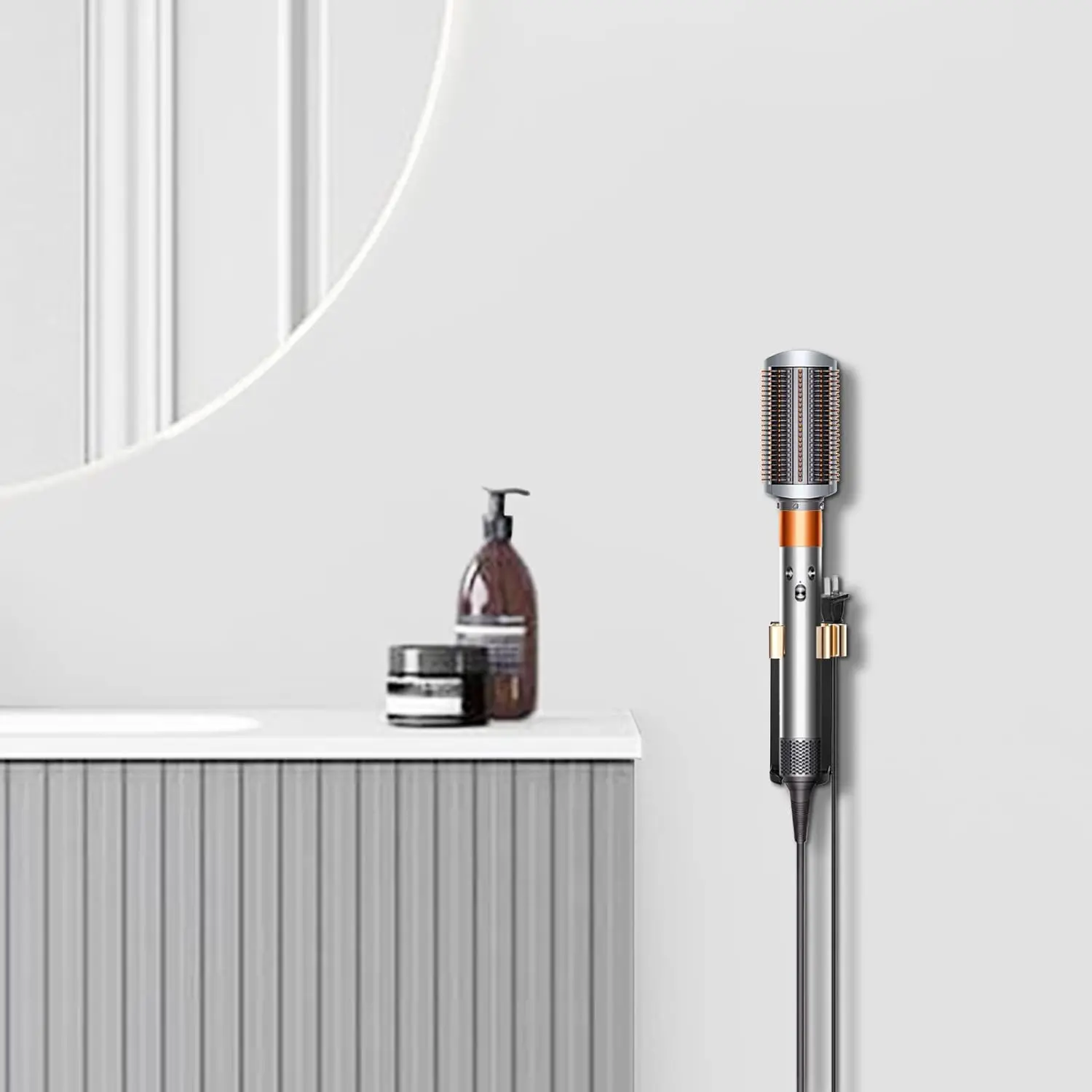 Keep your vanity or bathroom counter clutter-free with this versatile wall mount holder. Designed to accommodate various hair styling tools, including curling irons, hair straighteners, and roller rods, this holder is a must-have for any beauty enthusiast. It’s specifically designed to be compatible with the Dyson Airwrap multi-styler and its various attachments, offering a convenient and organized storage solution. Crafted from high-quality, thickened aluminum alloy, this holder combines durability with a sleek, modern aesthetic. Its smooth and delicate finish is resistant to corrosion, rust, wear, and scratches, ensuring long-lasting performance and a stylish addition to your space. The high-temperature resistance of the aluminum alloy allows you to safely store your hot styling tools without waiting for them to cool down completely. This feature provides added convenience and saves you valuable time during your styling routine. Installation is a breeze with two convenient options. Choose the no-drill method using the strong adhesive tape for a quick and easy setup, or opt for the traditional screw-mounting kit for a more secure and permanent installation. Either way, you’ll have your holder ready to use in no time. The wall-mounted design maximizes space efficiency, keeping your countertop neat and organized. The integrated cable clip on the right side of the holder provides a tidy solution for storing cords and plugs, preventing tangles and keeping your styling area clutter-free. This holder not only provides a practical storage solution but also adds a touch of elegance to your bathroom or vanity area. Its sleek design and durable construction make it a worthwhile investment for anyone looking to organize their hair styling tools and streamline their beauty routine.