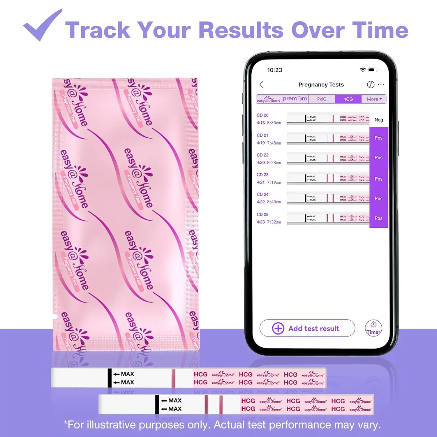 Discover peace of mind with Easy@Home Pregnancy Test Strips. Our reliable and accurate tests, powered by the free Premom fertility app, offer an affordable and convenient way to confirm pregnancy from the comfort of your home. These easy-to-use strips require just a quick 10-second dip in urine, followed by a 5-minute wait for results. The clear and simple result interpretation – two lines for pregnant, one line for not pregnant – eliminates any guesswork. With early detection capabilities, our tests can detect HCG levels as low as 25 mIU/mL, potentially revealing pregnancy before your expected period. Each home pregnancy strip is individually sealed for hygiene and assurance. Easy@Home empowers you with the knowledge you need, when you need it, to embark on your journey to parenthood with confidence. This 100-pack provides ample supply for tracking and confirming results. Get accurate results without breaking the bank and conveniently track your journey with the Premom app.